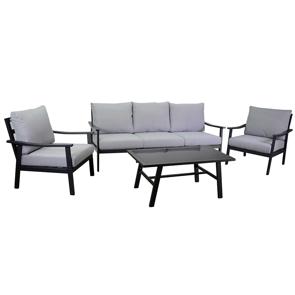 El conjunto se completa con una mesa central con tapa de cristal, perfecta para colocar bebidas y aperitivos, convirtiendo este conjunto en la pieza central de cualquier reunión social al aire libre. El diseño minimalista y contemporáneo del salón se integrará a la perfección en cualquier espacio exterior, añadiendo un toque de estilo moderno.