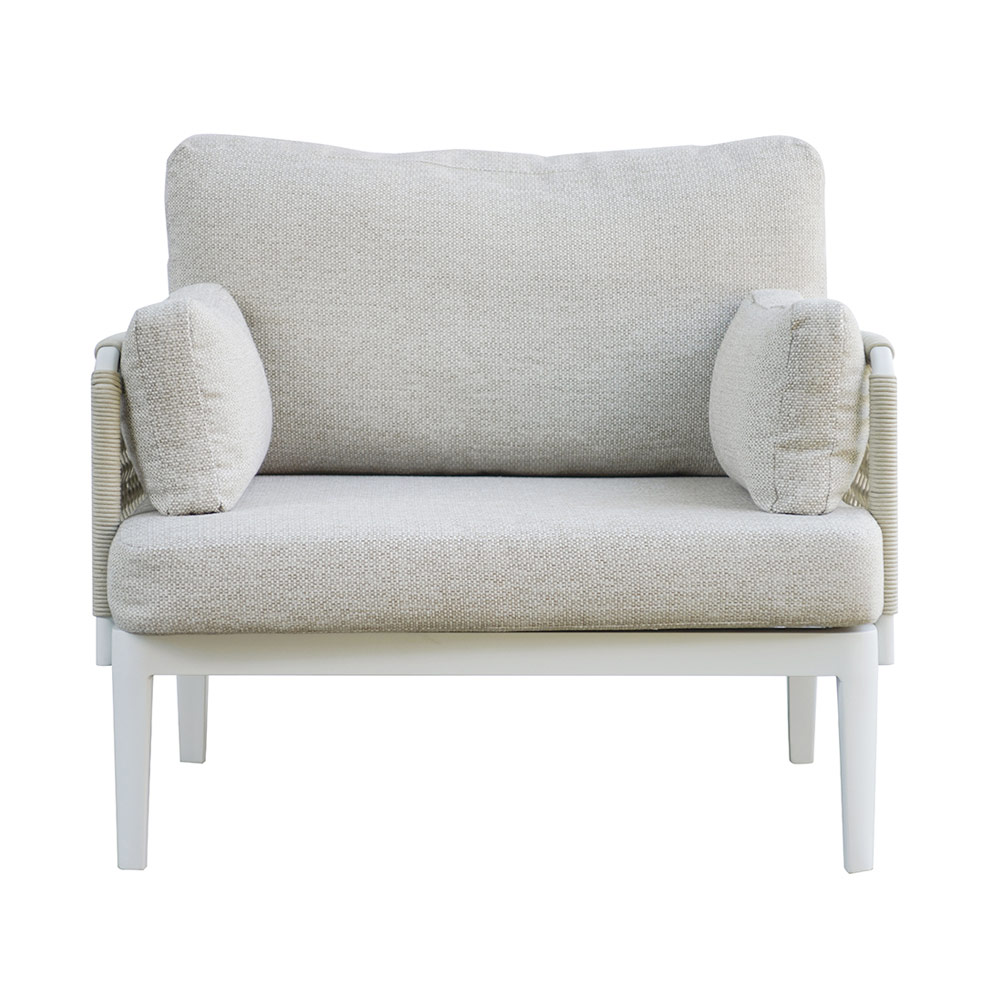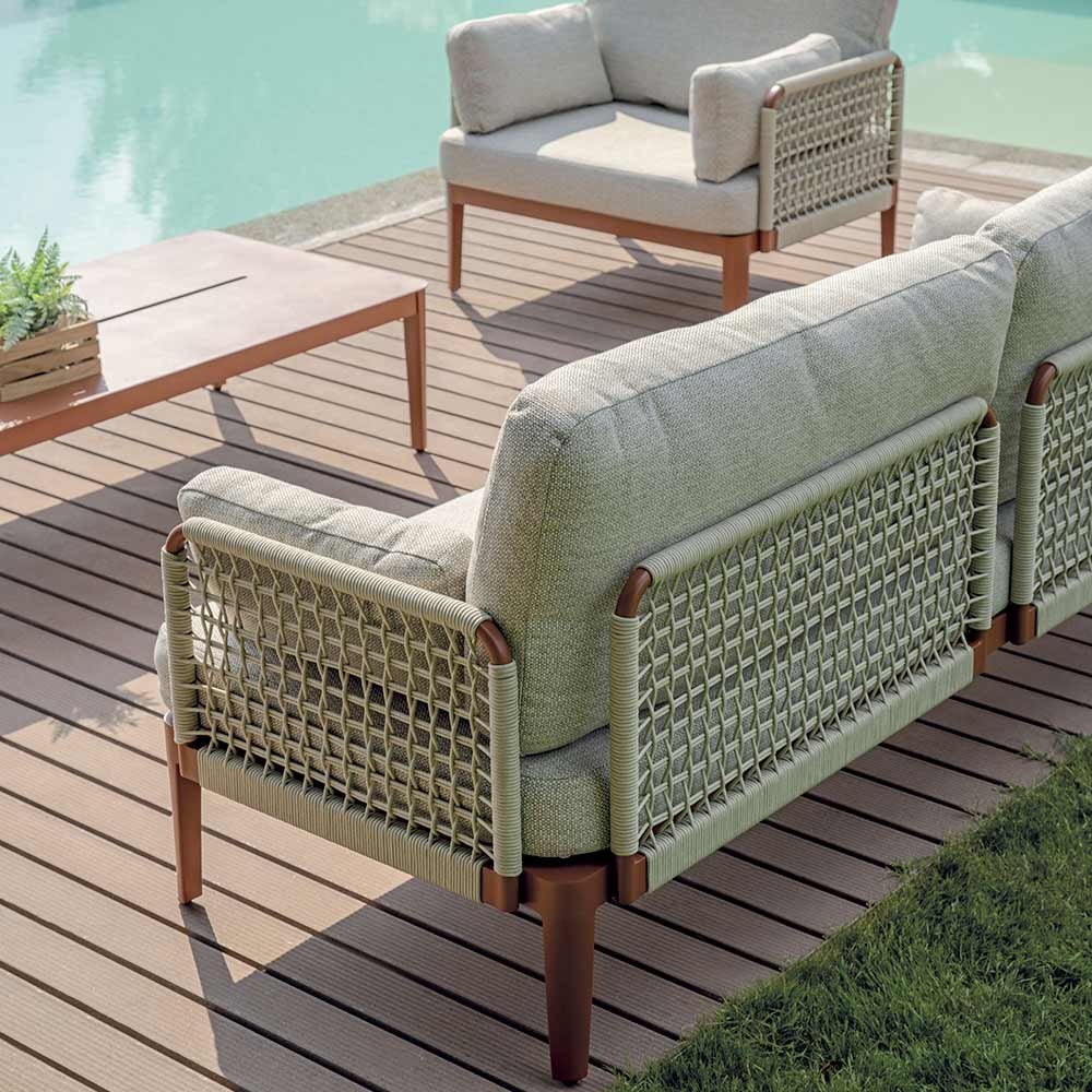 1 sofá: estructura de aluminio, respaldo y brazos de cuerda, cojines de tela desenfundables