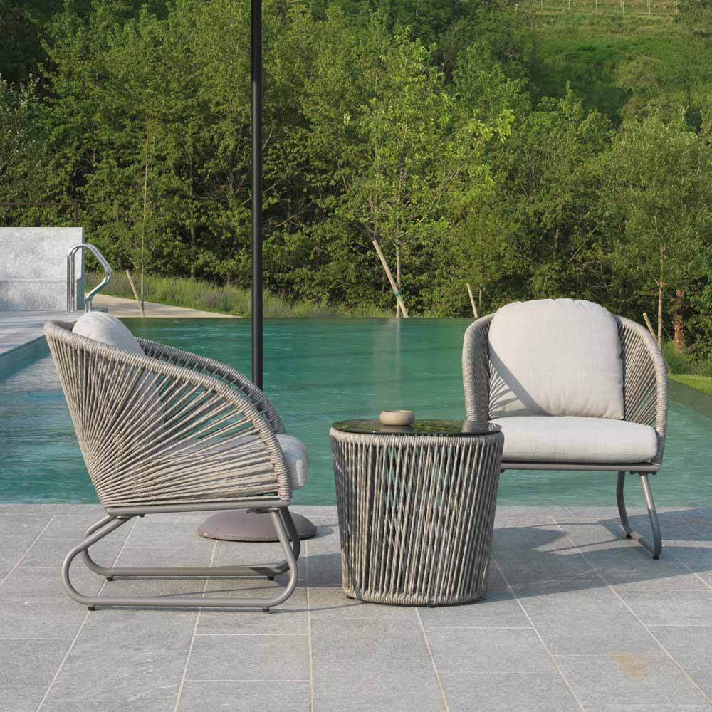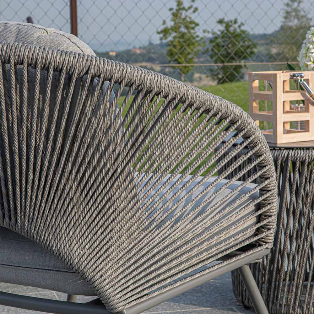 El armazón está fabricado en poliéster resistente a la intemperie y montado sobre una resistente base de aluminio que garantiza durabilidad y estabilidad. El color gris antracita de los asientos combina armoniosamente con la mesa de centro a juego , completando el aspecto elegante y moderno del conjunto.