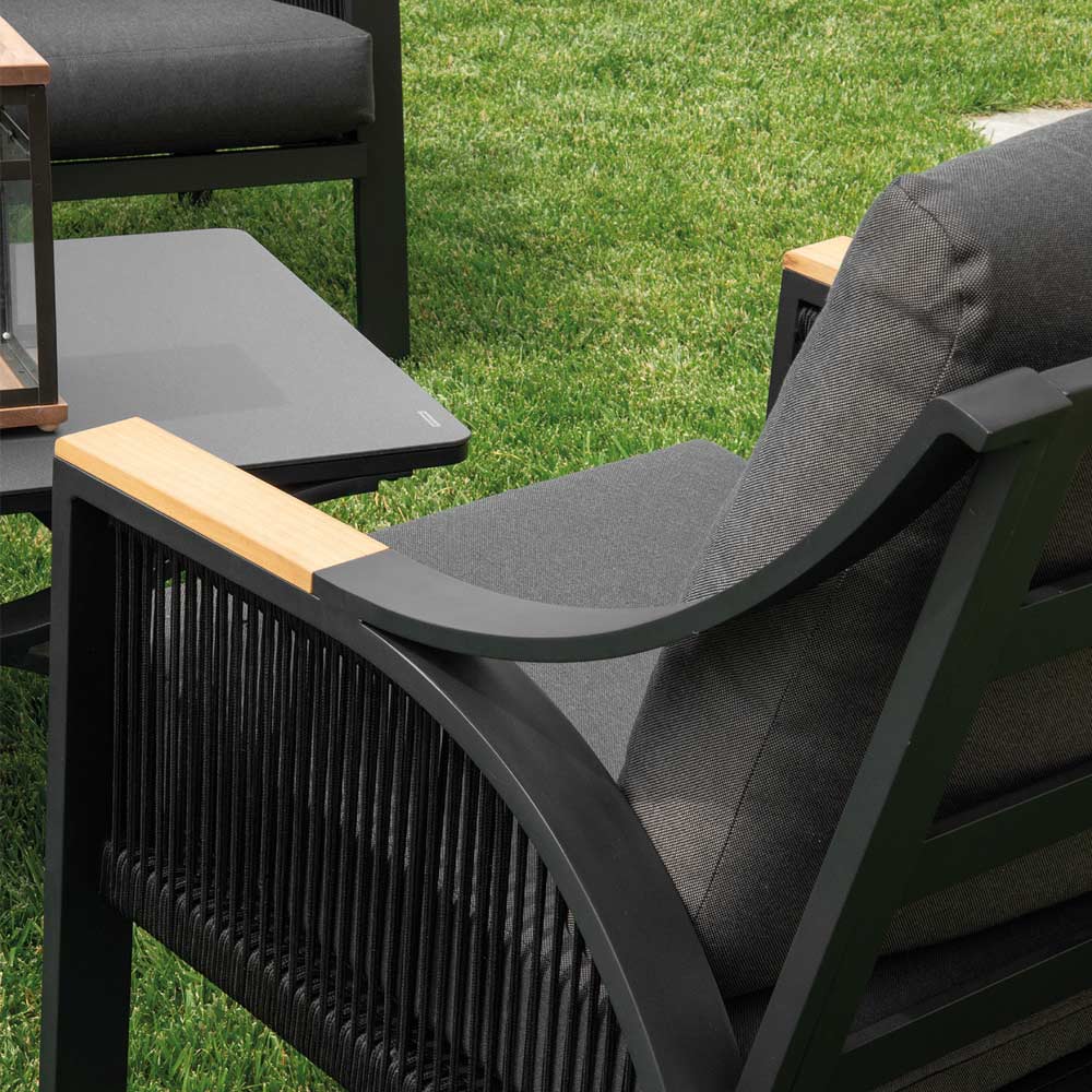 Equipado con reposabrazos con inserciones de madera, este salón no sólo es estéticamente agradable, sino también funcional, ofreciendo un apoyo cómodo para los momentos de relajación al aire libre.