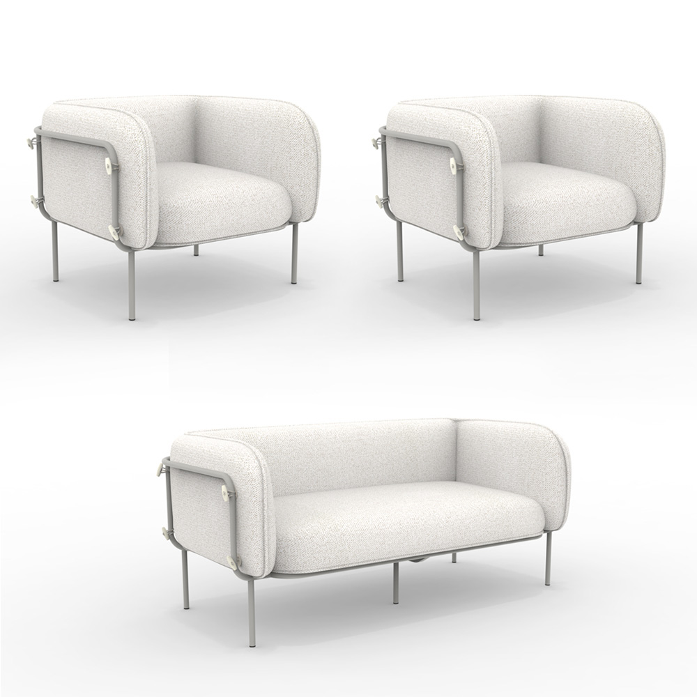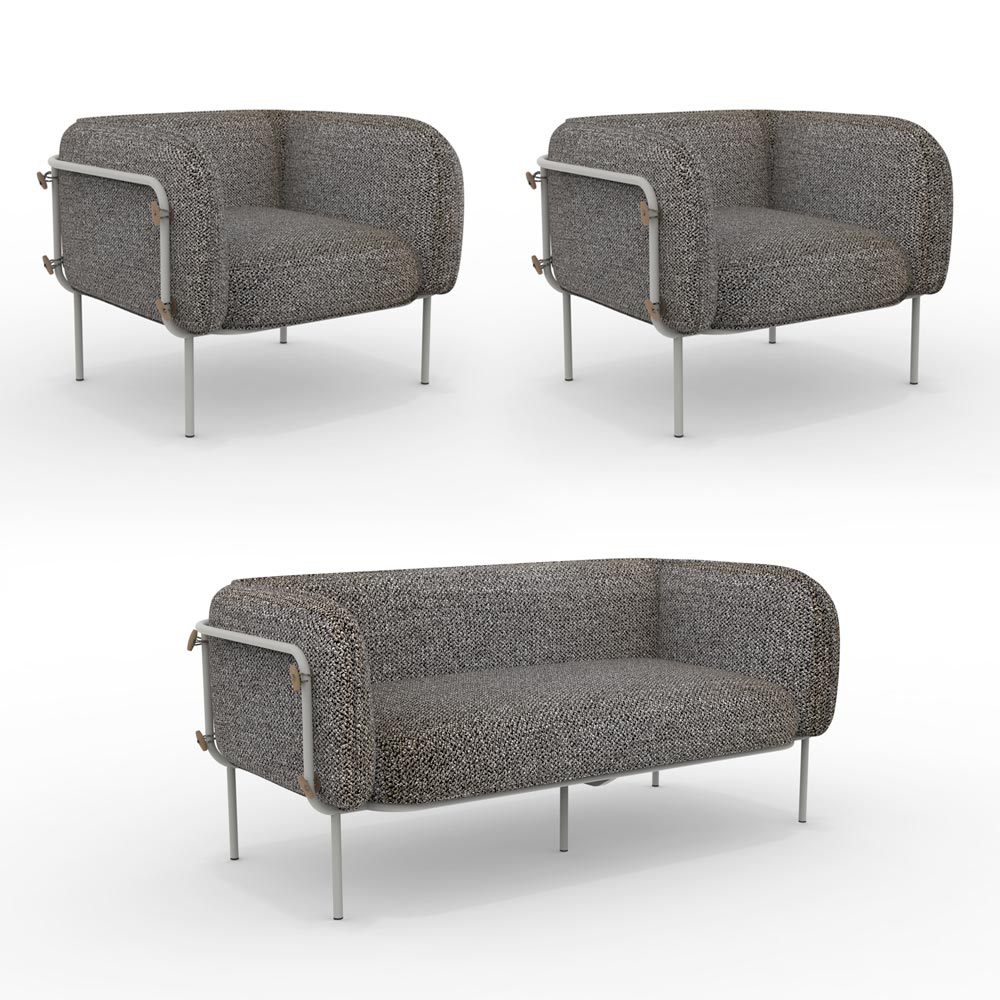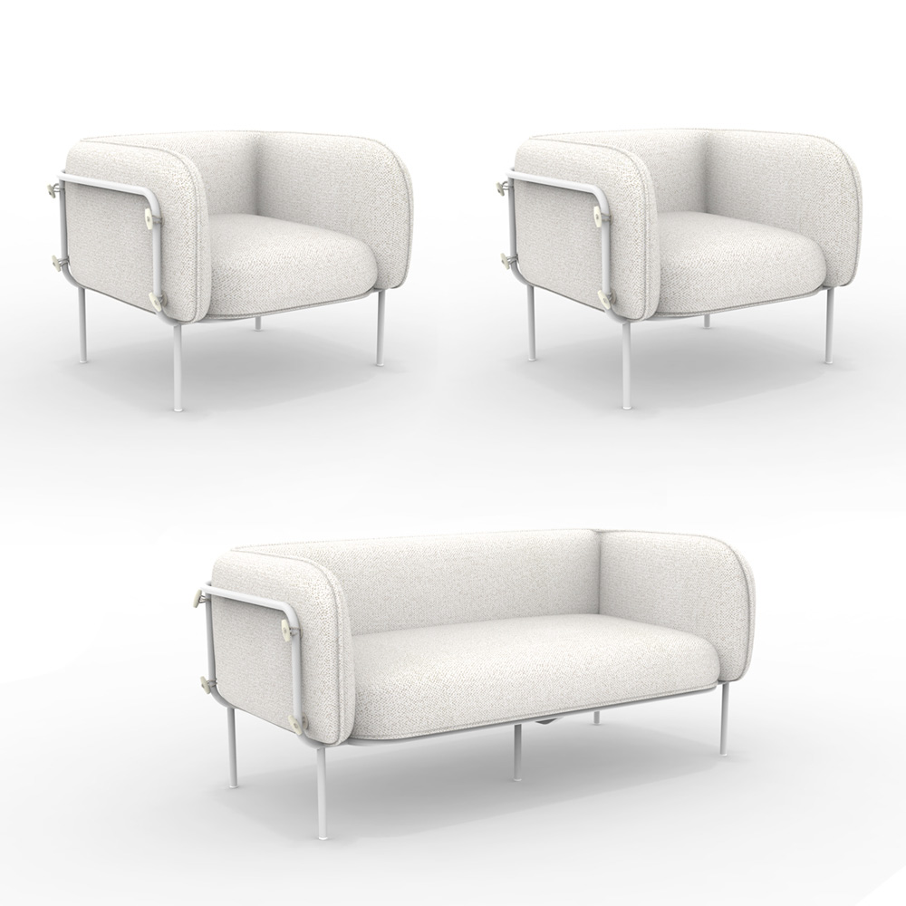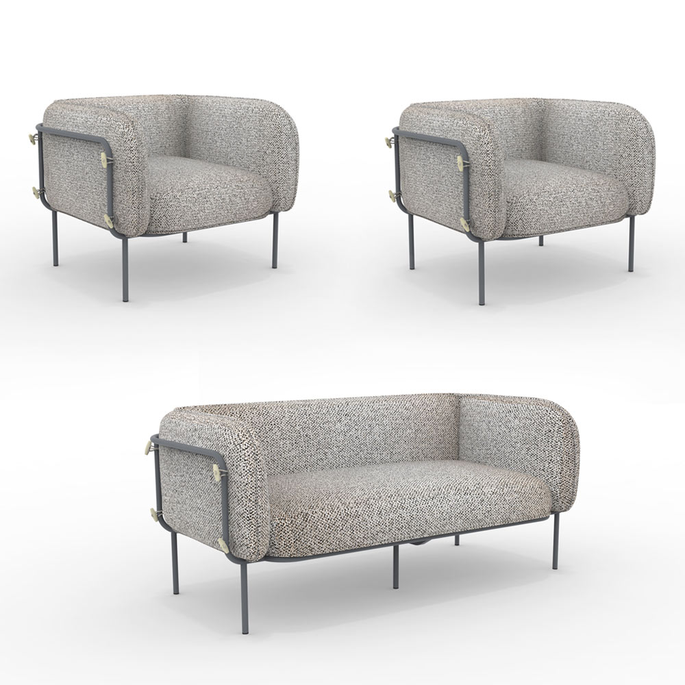 Conjunto de salónde exterior compuesto por 2 sillones bajos y 1 sofá de 2 plazas , realizado con estructura de hierro galvanizado pintado en polvo y asiento de tejido , íntegramente Made in Italy.