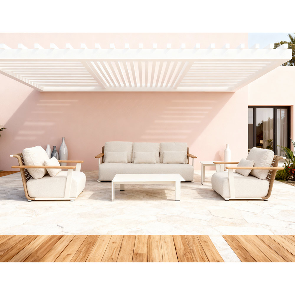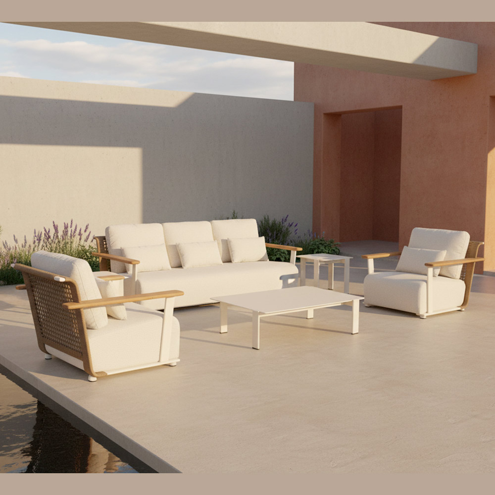 Es un salón pensado para quienes quieren disfrutar de espacios exteriores con estilo, calidad y durabilidad, perfecto para relajarse, disfrutar de un aperitivo con amigos o recibir invitados con un diseño que habla por sí solo.