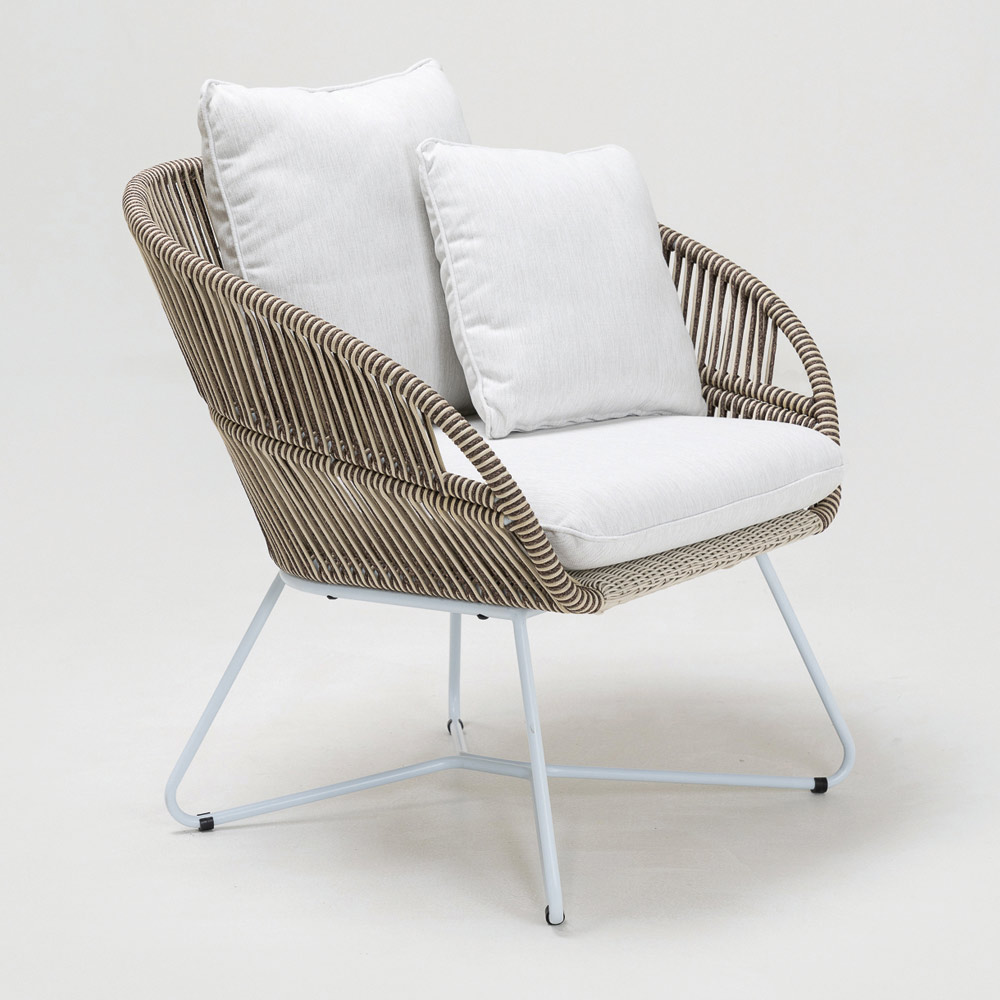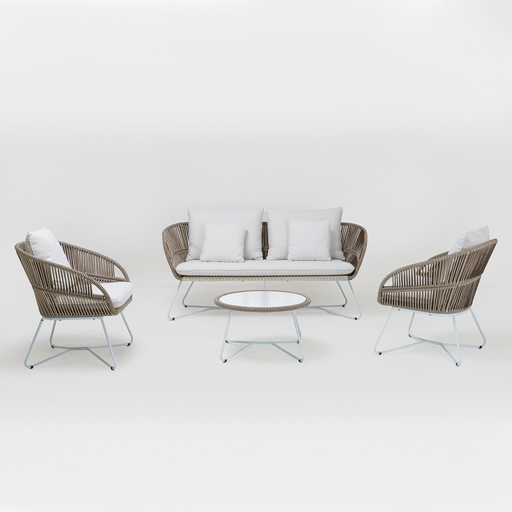 La estructura de cuerda añade un toque de resistencia y durabilidad frente a los elementos, manteniendo su belleza con el paso del tiempo. El diseño se realza aún más con los detalles de aluminio, que le dan un aire fresco y moderno, haciéndolo destacar en jardines, terrazas o junto a la piscina. La mesa de centro a juego, con su tapa de vidrio, es el complemento ideal para recibir bebidas y aperitivos, convirtiéndolo en el conjunto perfecto para tus invitados y para tus veladas al aire libre.