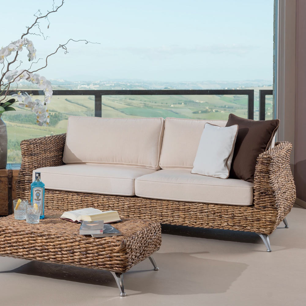 Salón de exterior compuesto por sofá de 2 plazas , sofá de 3 plazasy mesa de café-pouf en mimbre plátano natural tejido a mano con cojines estándarincluidos en el acabado estándarEcru.