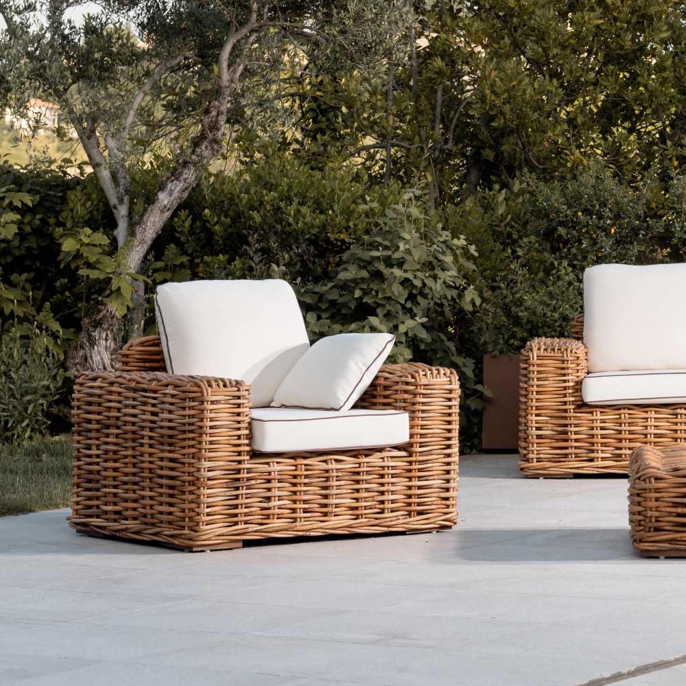 El salón pertenece a una colección que destaca por la forma cuadrada de los armazones, revestidos con un tejido rústico de fuerte impacto estético. La elaboración manual y el uso de un tipo especial de ratán natural con tonos iridiscentes -que recuerda los tonos del otoño y la maleza- confieren unicidad a cada pieza. Los productos de esta colección son adecuados para amueblar espacios exteriores protegidos como porches, balcones, terrazas, verandas y cenadores, animando los ambientes con una calidez y un estilo únicos.