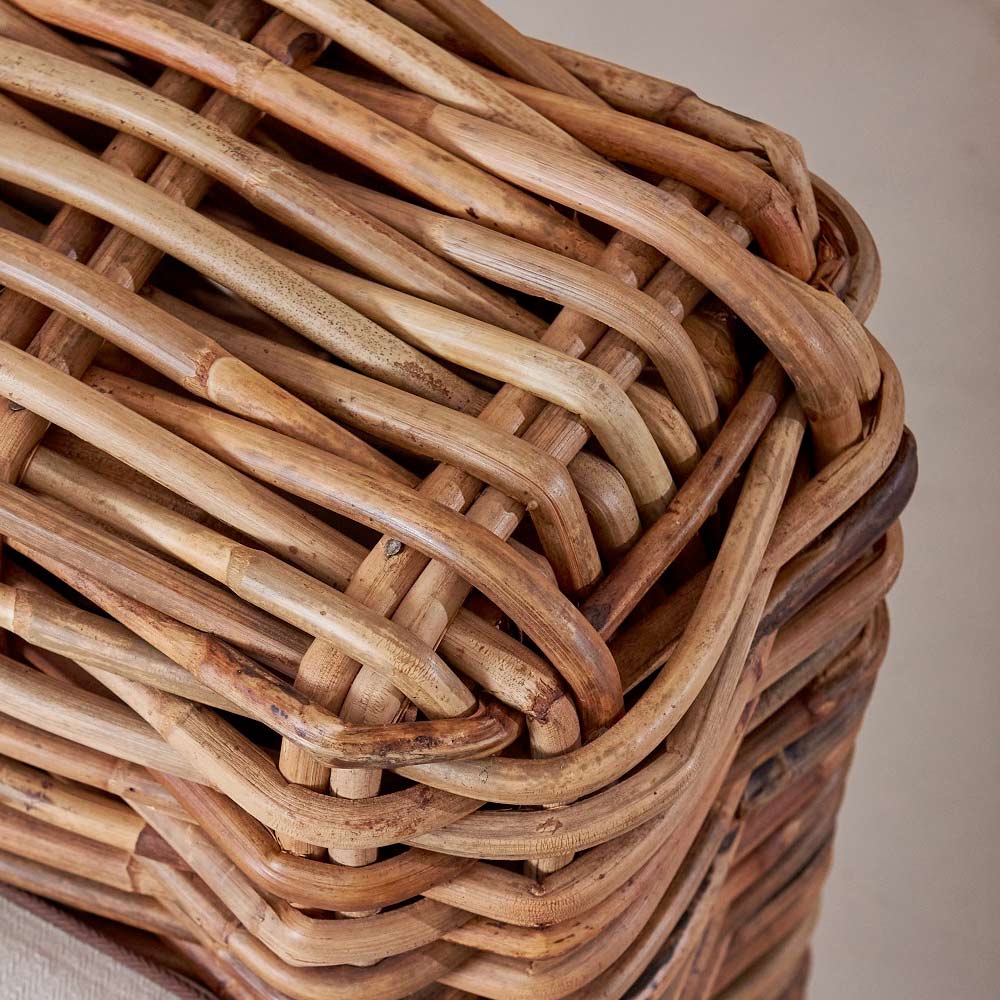 Mantenimiento : Para una correcta limpieza del Rattan natural recomendamos utilizar paños de microfibra, detergentes neutros y agua tibia. Recomendamos lavar el tejido de los cojines exclusivamente en seco o a mano y a baja temperatura para evitar que encoja y conserve sus características.
