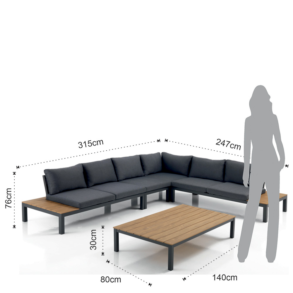 Este sofá esquinero con mesa de centro para jardín es el ejemplo del lujo moderno al aire libre . La combinación de robustas estructuras de aluminio y el uso de polimadera para los detalles de la mesa de centro y los extremos del sofá crean un contraste visual elegante y sofisticado . Los cojines gruesos y cómodos brindan una experiencia de asiento acogedora y relajante , perfecta para largas tardes de ocio o noches de socialización bajo las estrellas.
