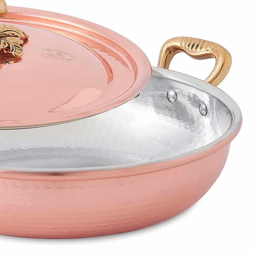 Sartén redonda de cobre macizo estañado martillado a mano y tapa, fabricada en Italia.