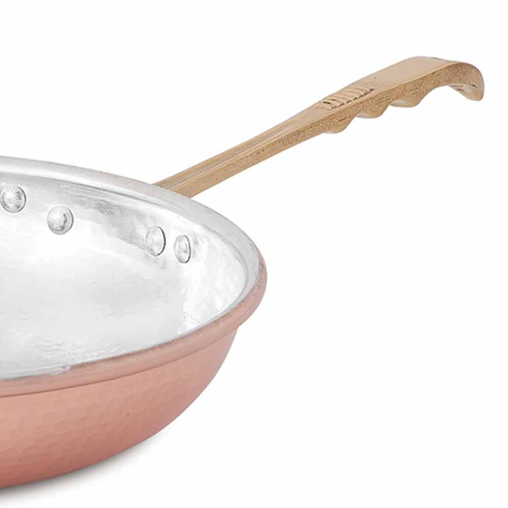 cobre macizo martillado y enlatado a mano al fuego es ideal para freír, tortitas, saltear pastas o glasear verduras.