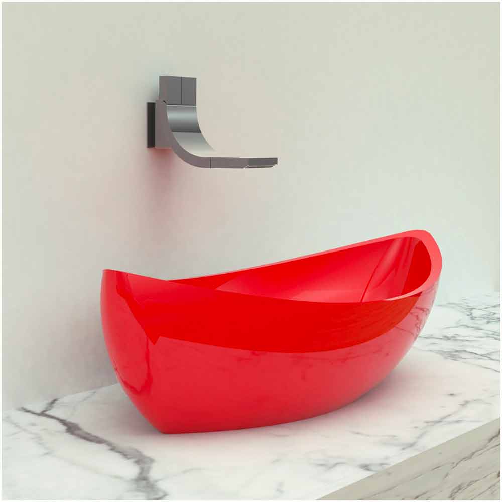 El concepto del lavabo Sashimi sigue las mismas líneas que la bañera Funamori, un pequeño bote de madera en el que se sirve sushi y sashimi en los restaurantes japoneses.