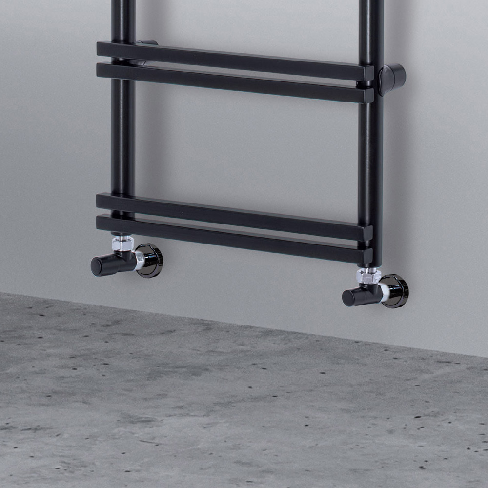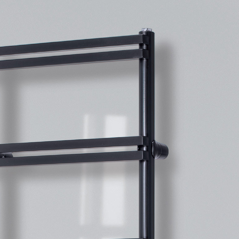 Secatoallas hidráulico en acero al carbonoacabado negro azabache compuesto por una serie de elementos horizontales de sección cuadrada de 2 cm soldados a colectores verticales de 3,5 cm de diámetro, íntegramente fabricados en Italia con kit de fijación a la pared, válvula de ventilación y tapón ciego incluidos . El carácter artesanal es la característica que garantiza la excelente calidad de este producto típico Made in Italy. Este producto es capaz de satisfacer las necesidades y deseos de un usuario cada vez más atento y exigente gracias a los acabados y materiales de primera elección utilizados para su construcción.
