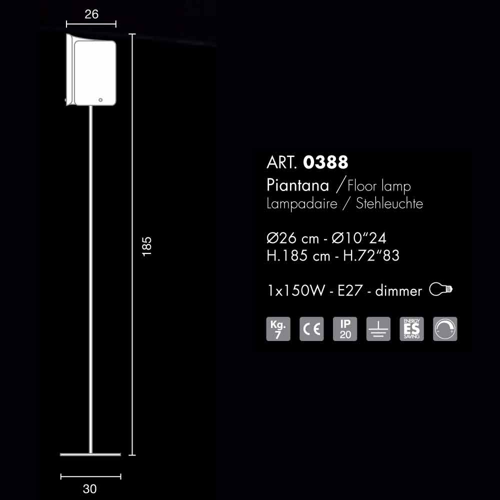 Selene Papiro lámpara de pie de diseño H185cm cristal Ø26 El papiro es una increíble colección rica y versátil, que reúne todos los tipos de lámparas divididos en varias variaciones de forma, tamaño y número de fuentes de luz. El difusor, con una forma particular; clara extra-vidrio en la versión de satén. Preparado para el 'uso de 1 lámpara de 150W E 27 (no incluido).