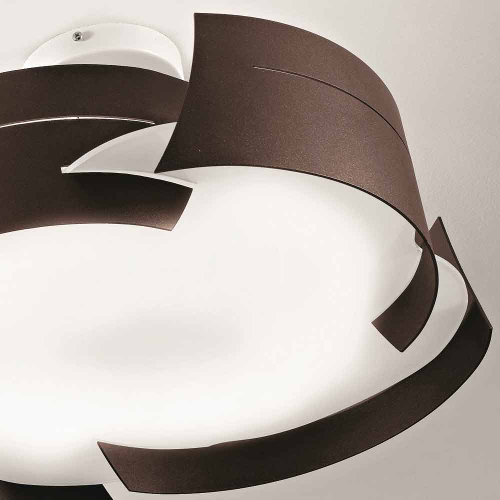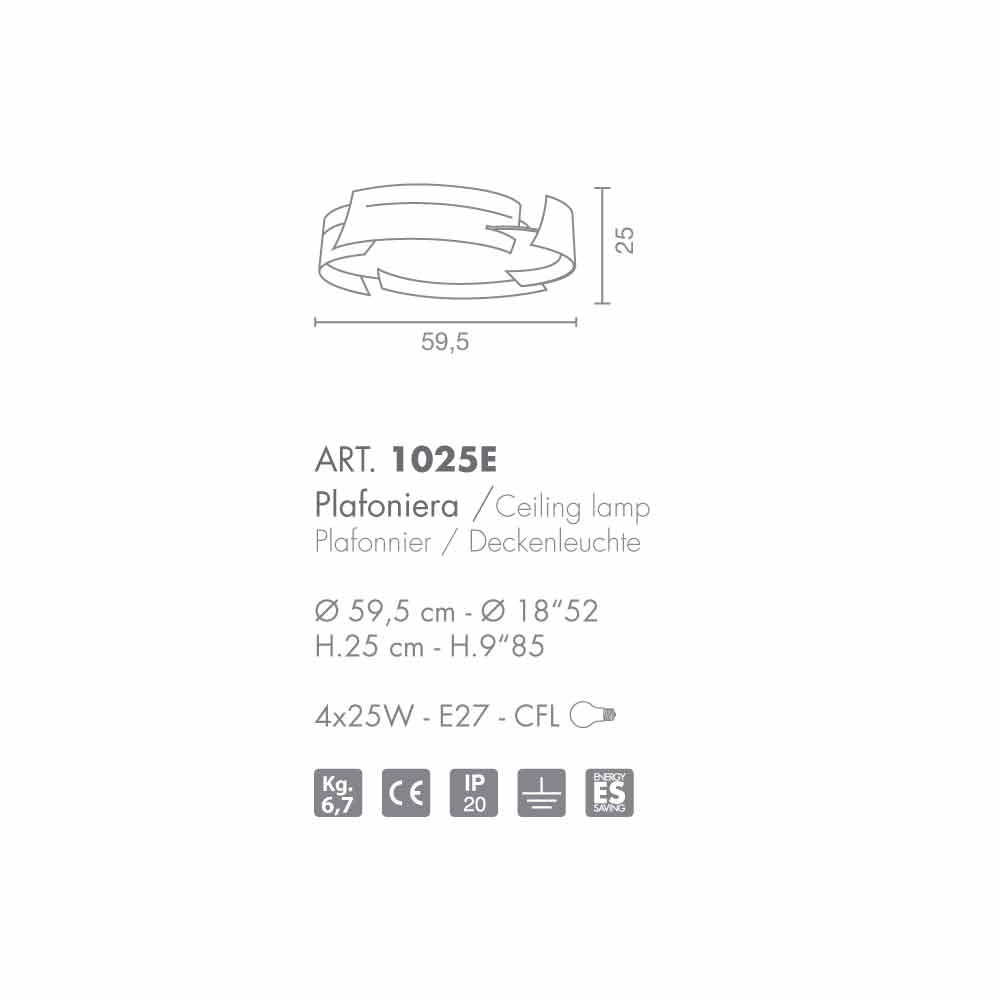Selene Vultur diseño del techo Ø59,5 H 25 cm Made in Italy Vultur es una colección con un diseño dinámico, articulado en suspensión y el techo de dos dimensiones. La estructura principal está hecha de acero, mientras que el difusor está hecho de PMMA. Los acabados disponibles son: pan de oro o bronce oscuro. Preparado para el 'uso de 4 bombillas 25W - E27 - CFL.