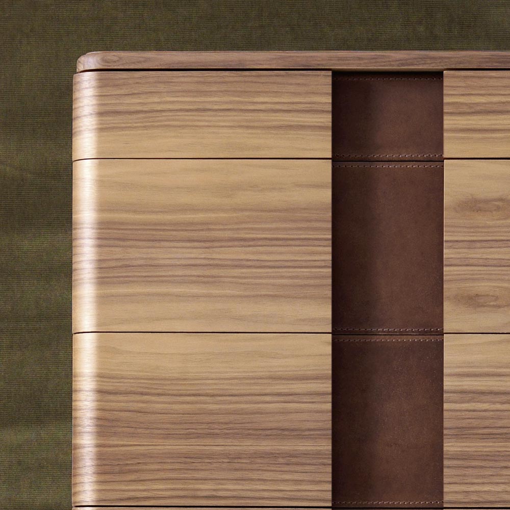 Hecho en Italia a mano con pasión y atención al detalle en el procesamiento de materiales de alta calidad. Compuesto por una estructura de madera contrachapada curvada chapada en nogal canaletto. Base y parte superior en madera maciza de nogal canaletto e inserciones frontales en piel natural. Los siete cajones tienen rieles deslizantes retráctiles con un sistema de cierre silencioso.