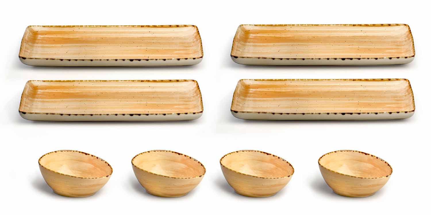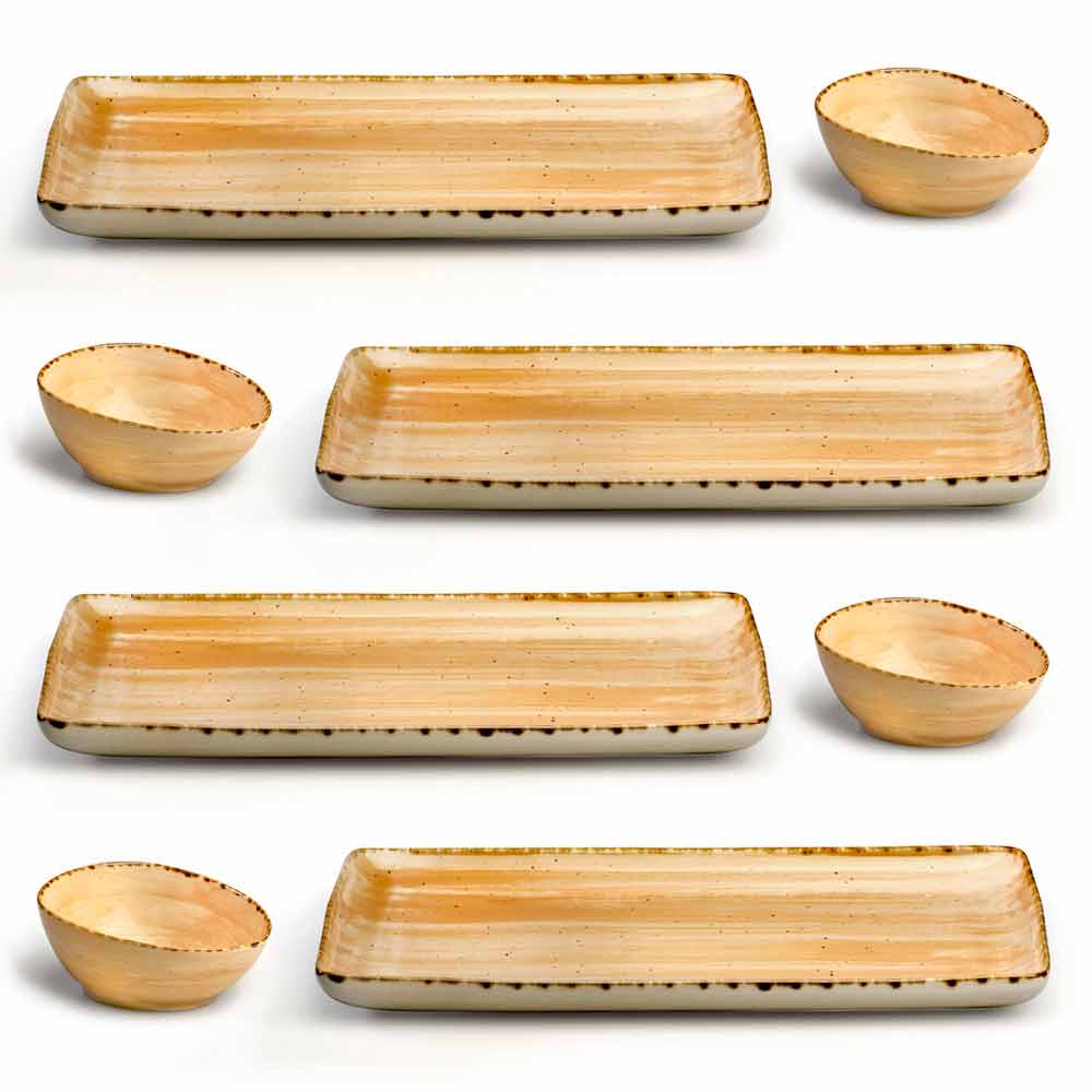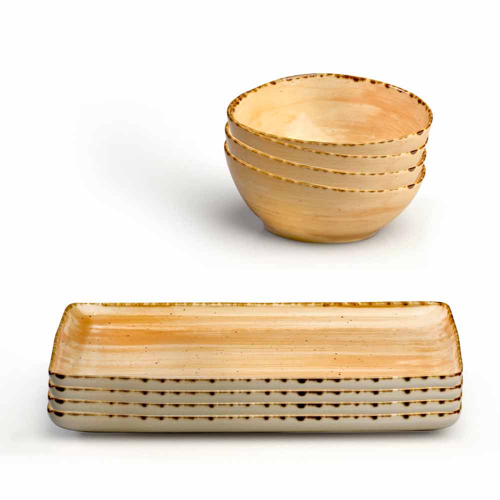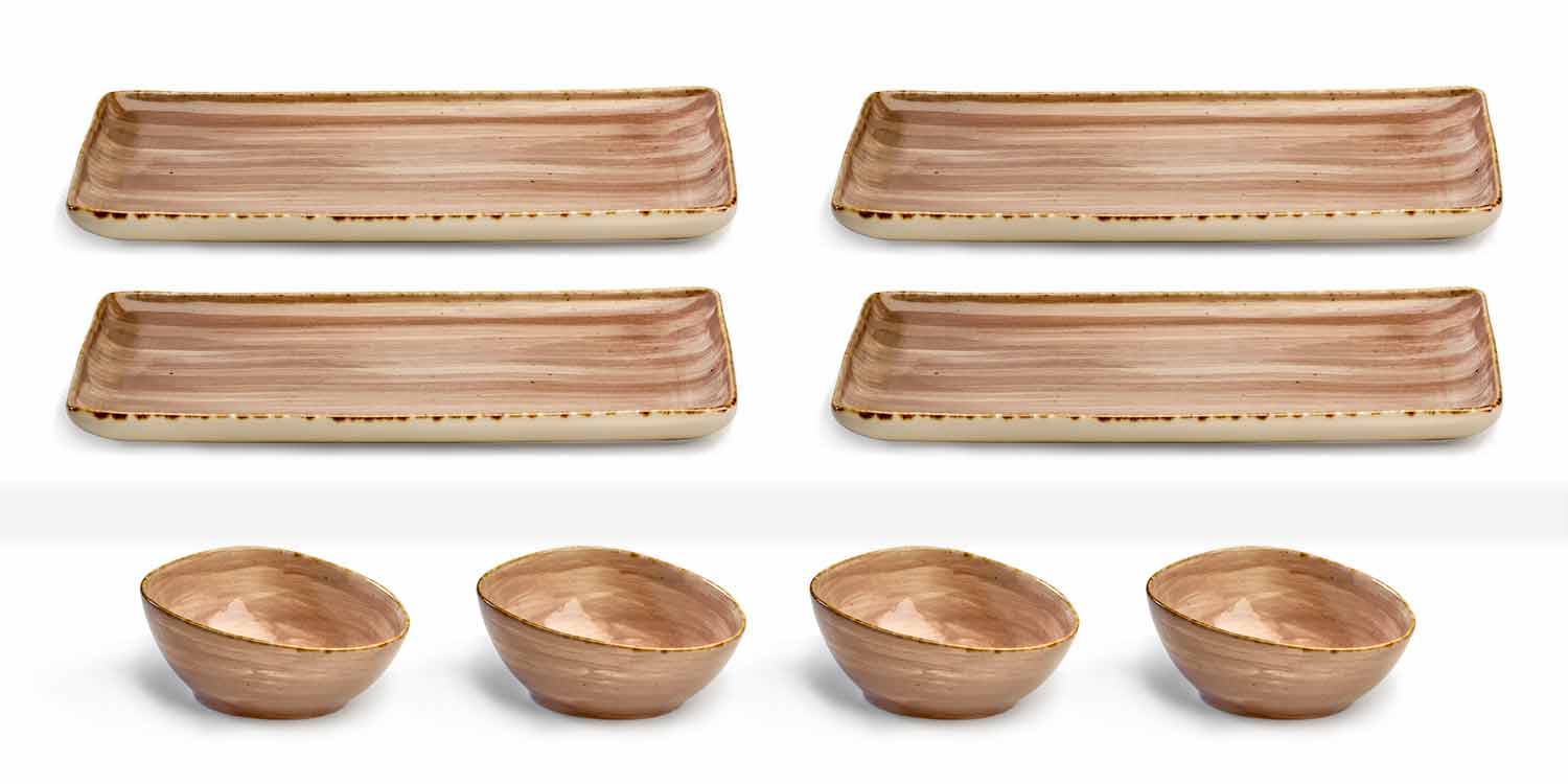 Platos de diseño moderno y versátil, 4 cuencos redondos y 4 platos rectangulares en gres de colores.