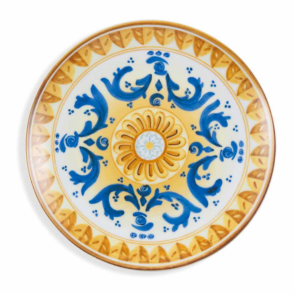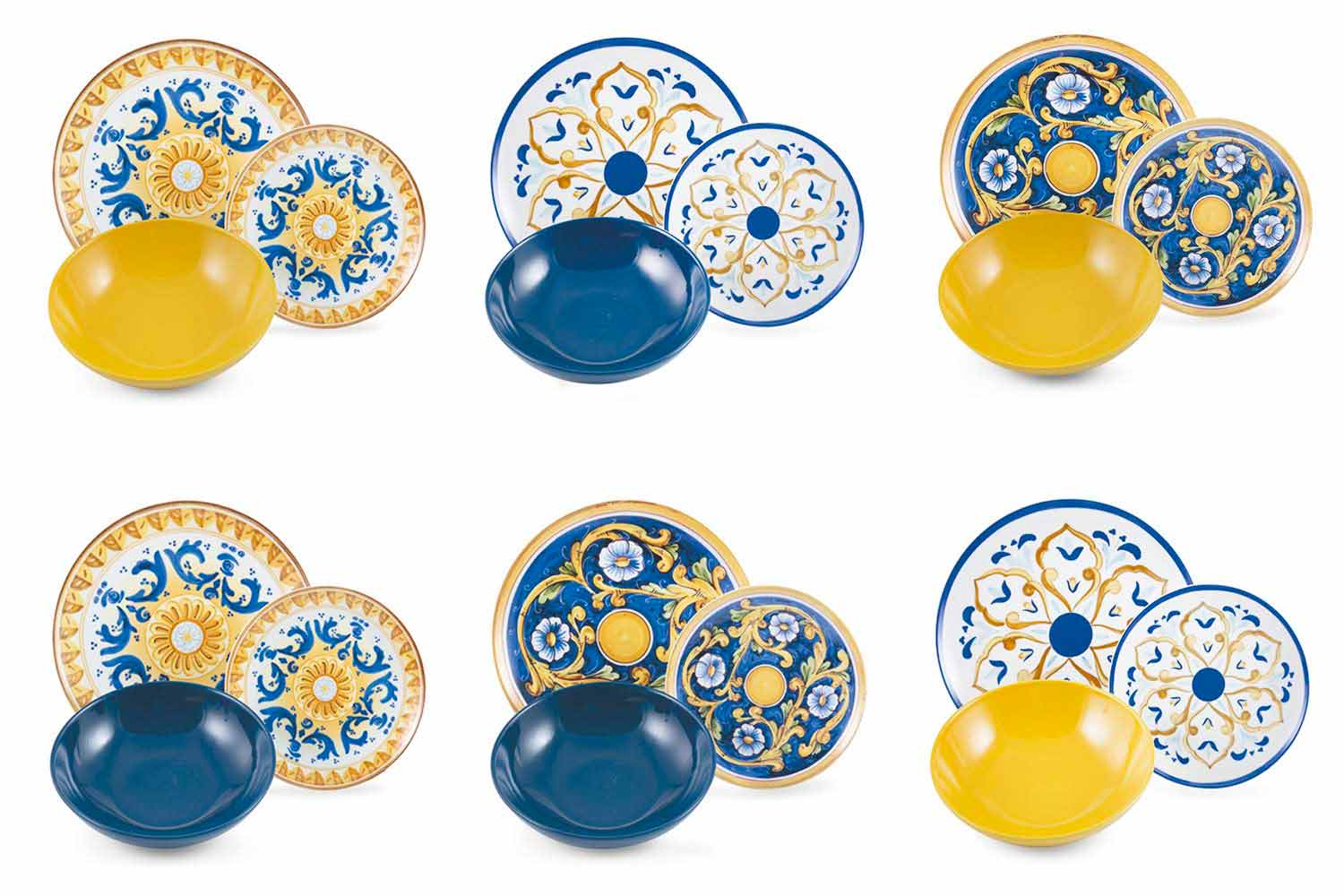 Servicio de mesa en porcelana y gres de color azul y amarillo, diseño moderno de 18 piezas.