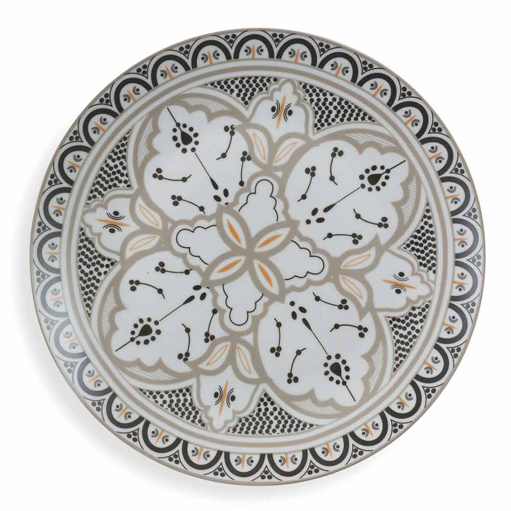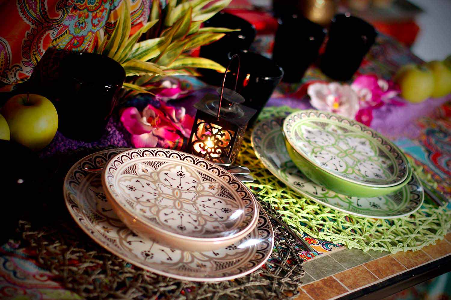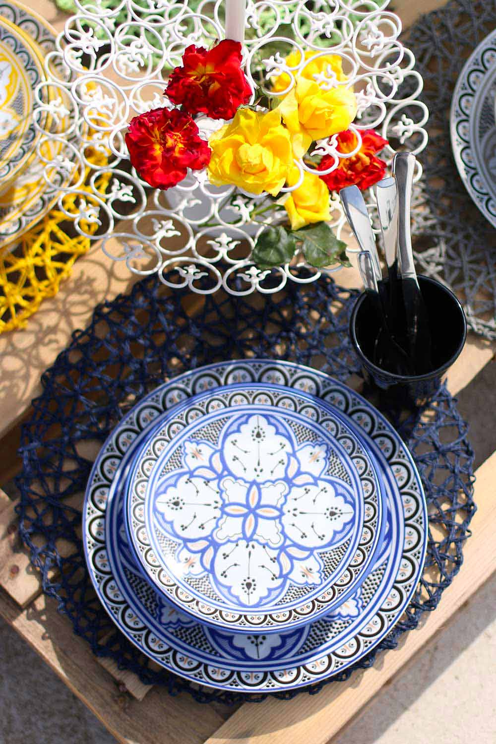 Este servicio nos acompaña a descubrir las decoraciones étnicas en Marruecos . En el centro de cada plato está, de hecho, el arabesco grande y geométrico utilizado en lugar de la flora y la fauna cuya representación estaba prohibida por las leyes sagradas del lugar.