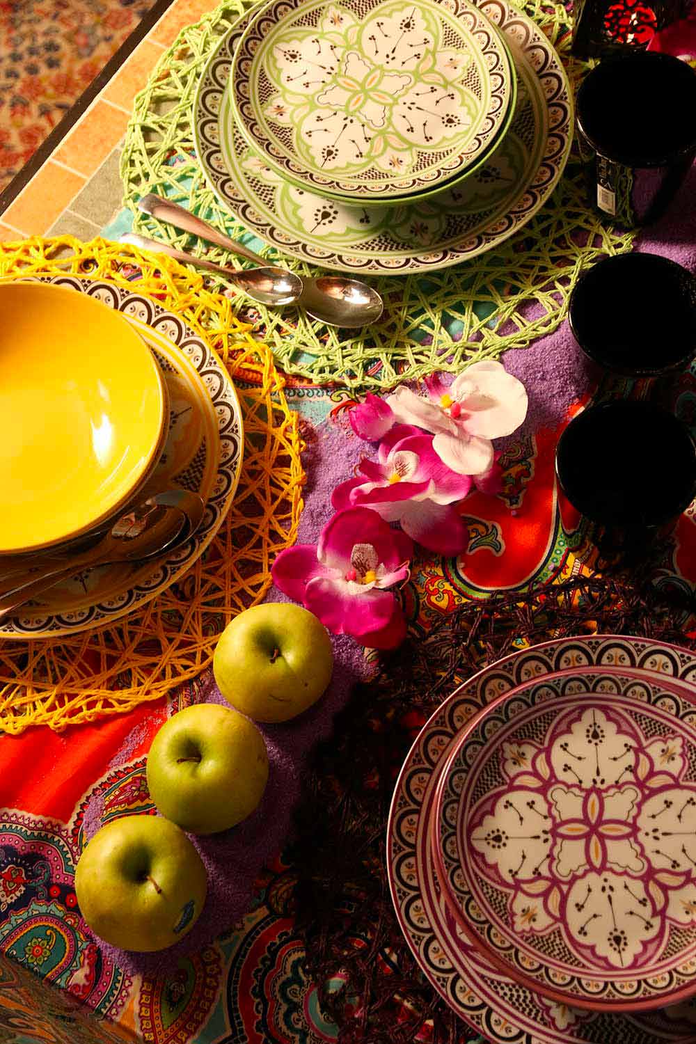 El estilo de este kit, en perfecta armonía entre la cultura oriental e hispana y la morisca, es una referencia clara a la historia de la famosa y elegante cerámica marroquí con diseños geométricos y refinados, atribuyendo a cada huésped un color diferente al de todos los demás. otros, para simbolizar la filosofía de que todos participan en la convivencia de una manera diferente .
