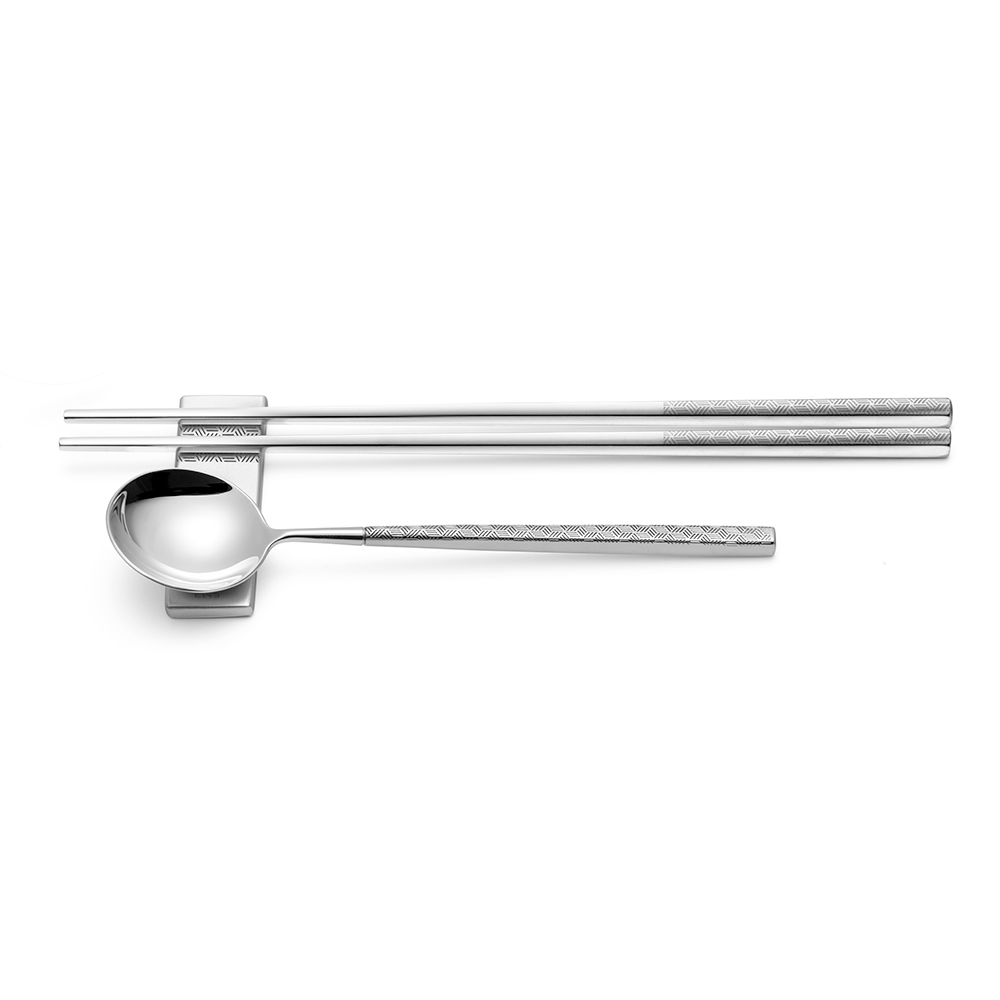 Los palillos largos y delgados están diseñados para un uso cómodo y un agarre seguro, mientras que la cuchara tiene una profundidad óptima para sorber caldos y salsas con facilidad. El elemento distintivo es la base cuadrada que sirve de apoyo para los cubiertos, asegurando que permanezcan siempre limpios y bien presentados cuando no se utilizan.
