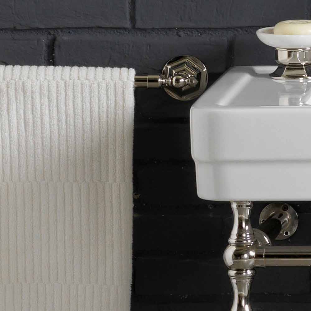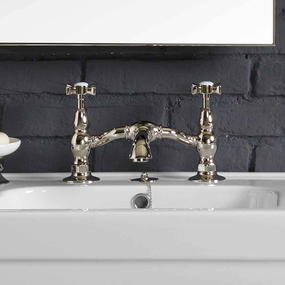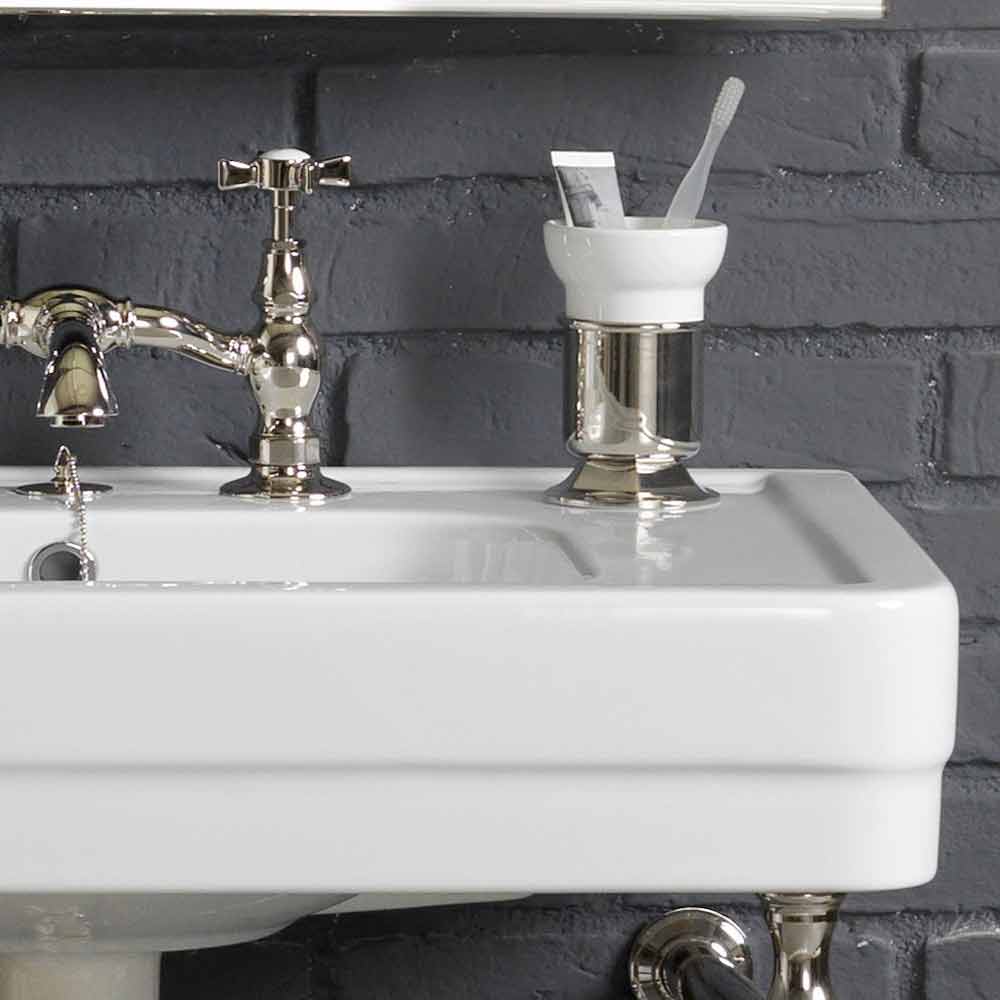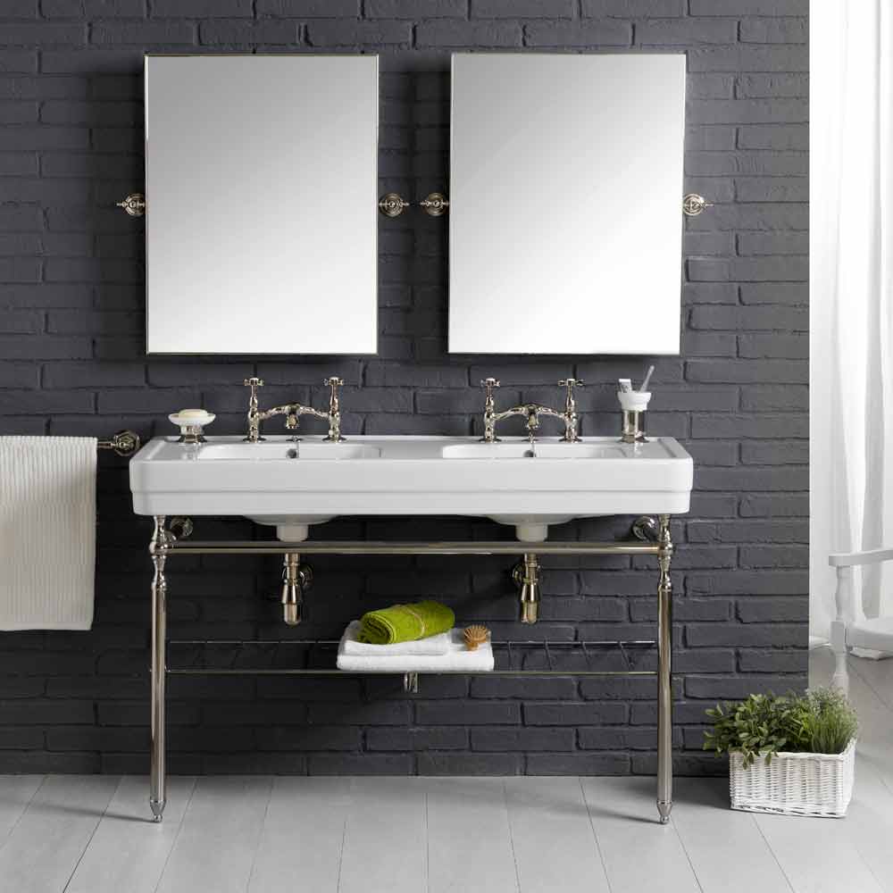 Partes incluidas en la composición: - Lavabo de cerámica blanca. Medidas: L.130 cm x P.51 cm - Base metálica + rejilla base. Acabado en níquel pulido L.130 cm x h. 76 + 13 cm x 51 cm de voladizo de pared - 2 grifos de puente junto con cadena - 2 sifones - 2 desagües - 2 espejos rectangulares basculantes con marco de metal de latón en acabado níquel pulido. Medidas: 76,5cm x 57,5cm. - Soporte para cepillo de dientes independiente - Jabonera de cerámica sobre encimera
