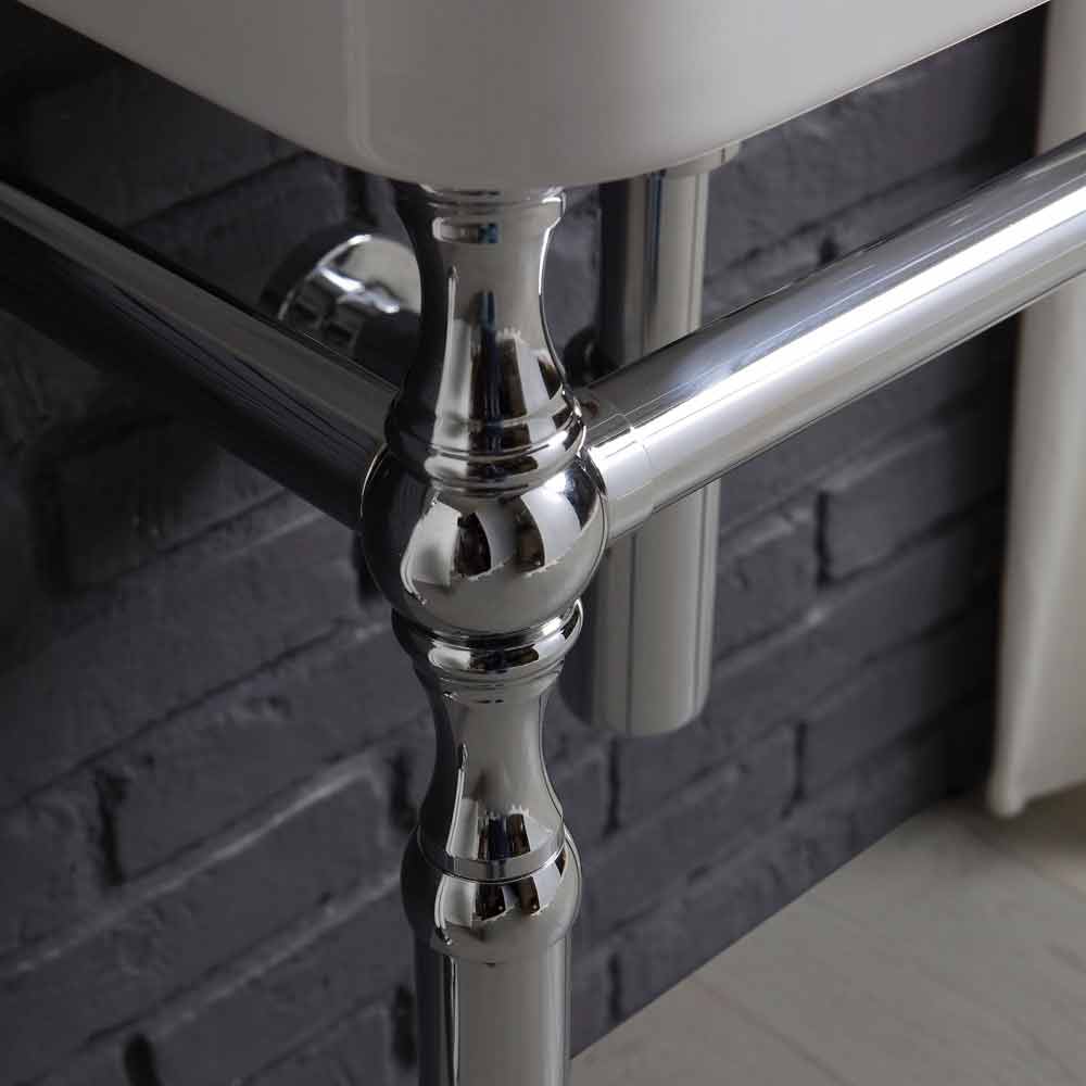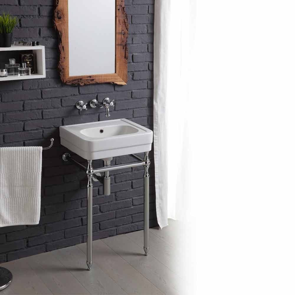 Partes incluidas en la composición: - Lavabo cm. L.50 cm x P.40,5 cm - Ancho de la base de metal cromado. 41 cm x Saliente de pared 34 cm x H: 76 cm - Grifo de pared cromado - Desagüe cromado - Sifón cromado - Toallero, portarrollos y portaescobillas de cerámica cromado. - Espejo con marco de madera de briccola antigua 55x75 cm
