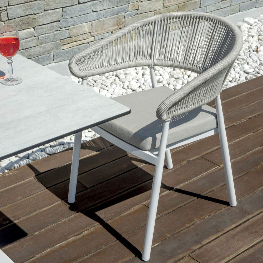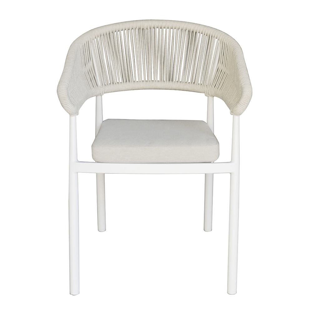 Da un toque de estilo sofisticado y practicidad a tus ambientes de exterior con esta silla de diseño moderno. El respaldo de cuerda añade un elemento de elegancia artesanal, mientras que el asiento de lamas de aluminio proporciona resistencia y comodidad, por lo que es ideal para el uso diario.