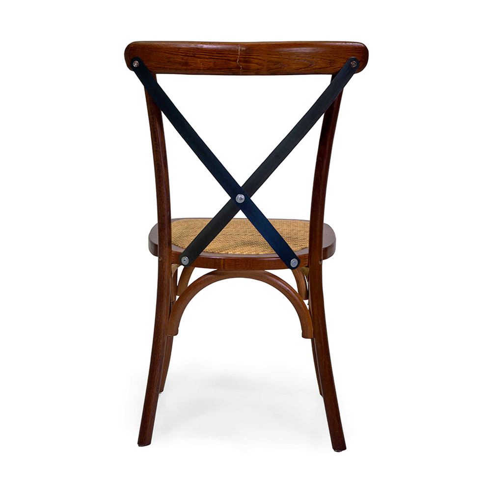 Esta silla de madera combina el encanto del diseño clásico con detalles que realzan su elegancia atemporal . El robusto armazón de madera garantiza solidez y durabilidad , mientras que el respaldo de hierro en forma de X añade un toque de estilo industrial que encaja a la perfección con la estética tradicional.
