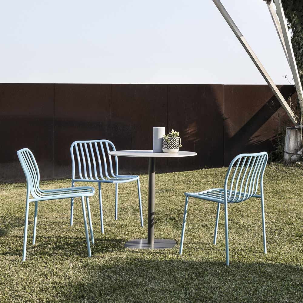 Silla de exterior con estructura de metal pintado caracterizada por el respaldo y el asiento con trama de alambre con formas ovaladas verticales que siguen armónica y sinuosamente las formas ergonómicas de la estructura, adaptándose mejor a la silueta del cuerpo para ofrecer un confort óptimo . Un mueble que proviene de un proceso de producción 100% Made in Italy mediante el uso de materias primas de alta calidad que ofrecen un resultado sólido y resistente .