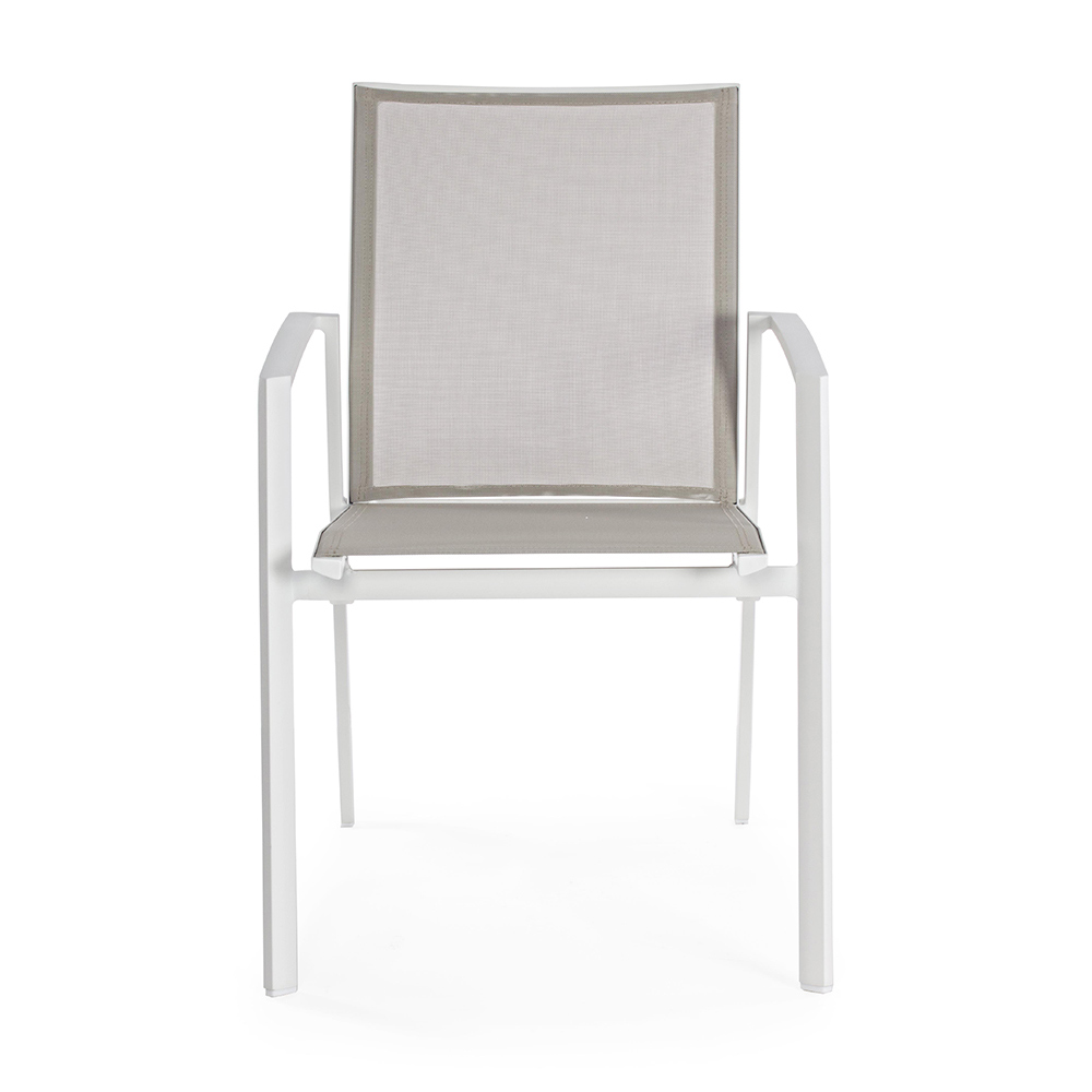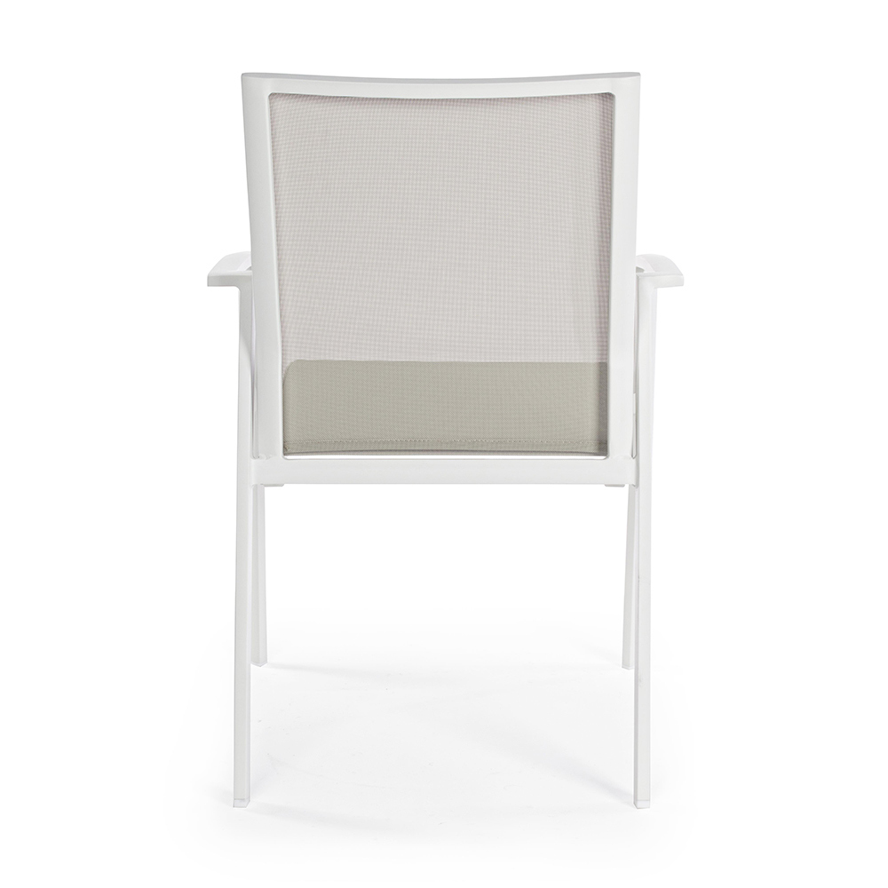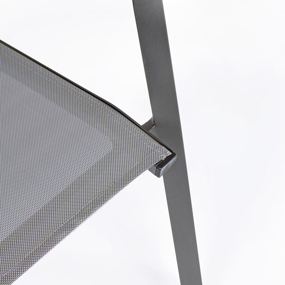 Estructura de aluminio pintado en polvo (poliéster). Asiento y respaldo tapizados en textilene Phifer 1x1. Apilable.