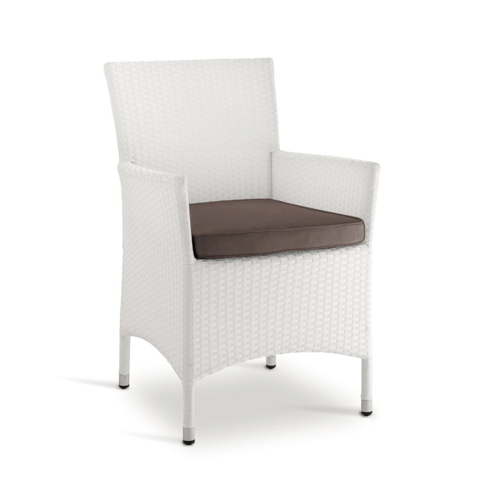 Sillón de exterior apilable en aluminio y mimbre blanco.