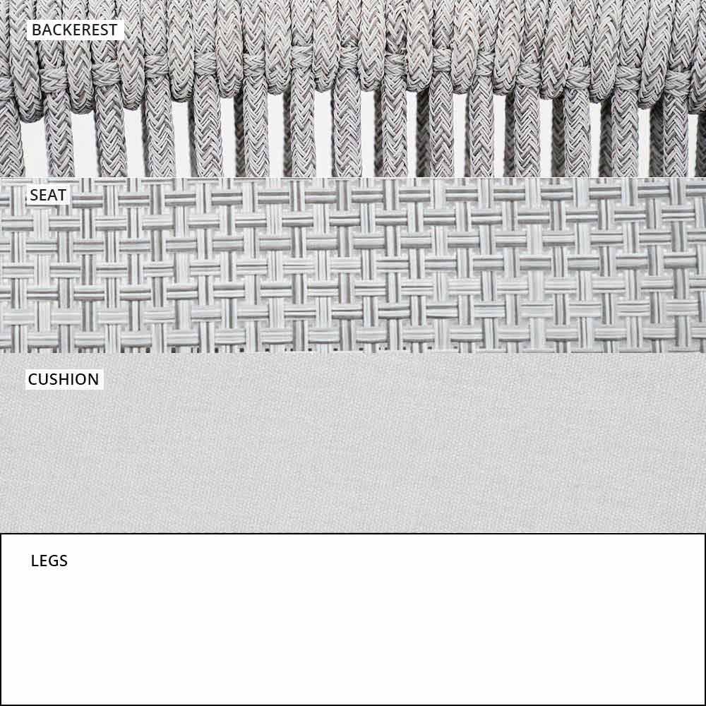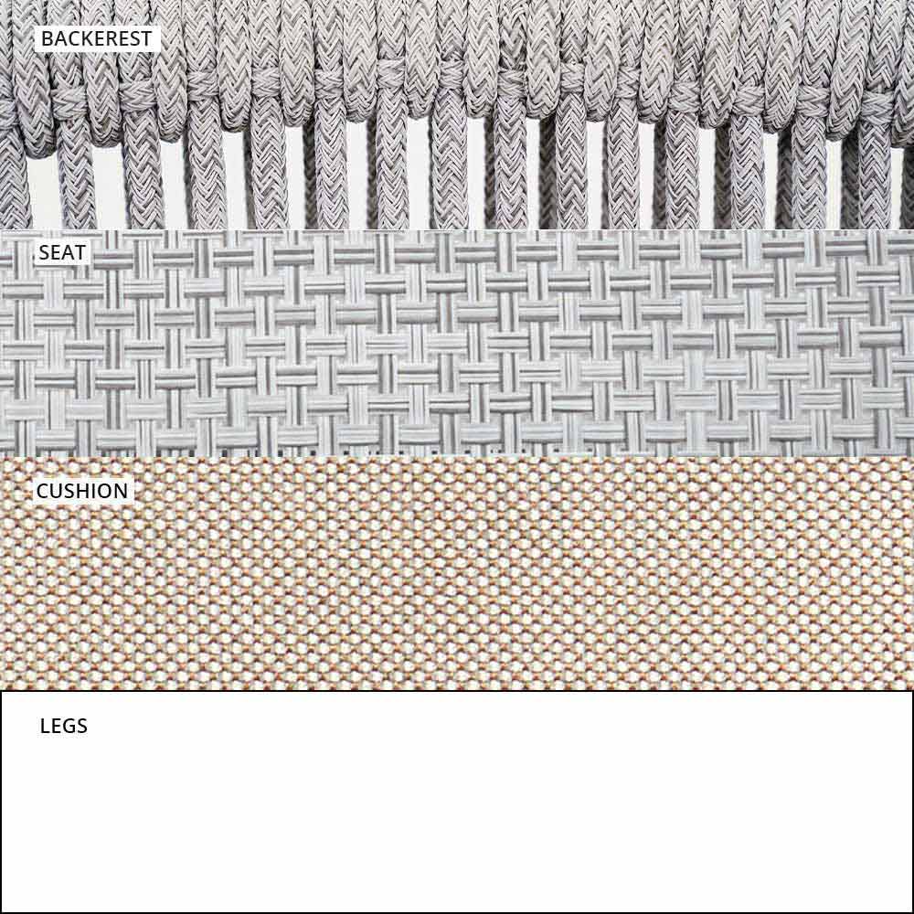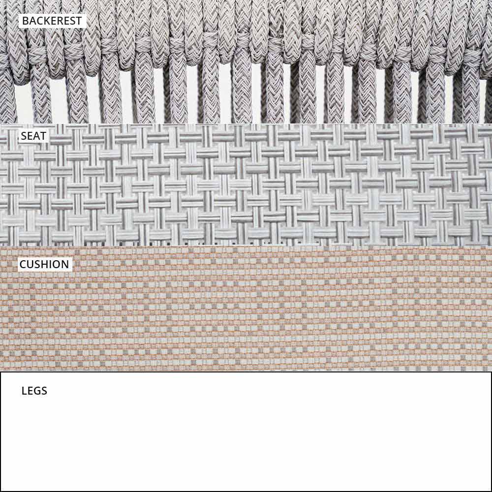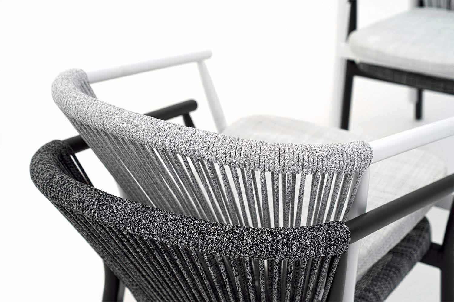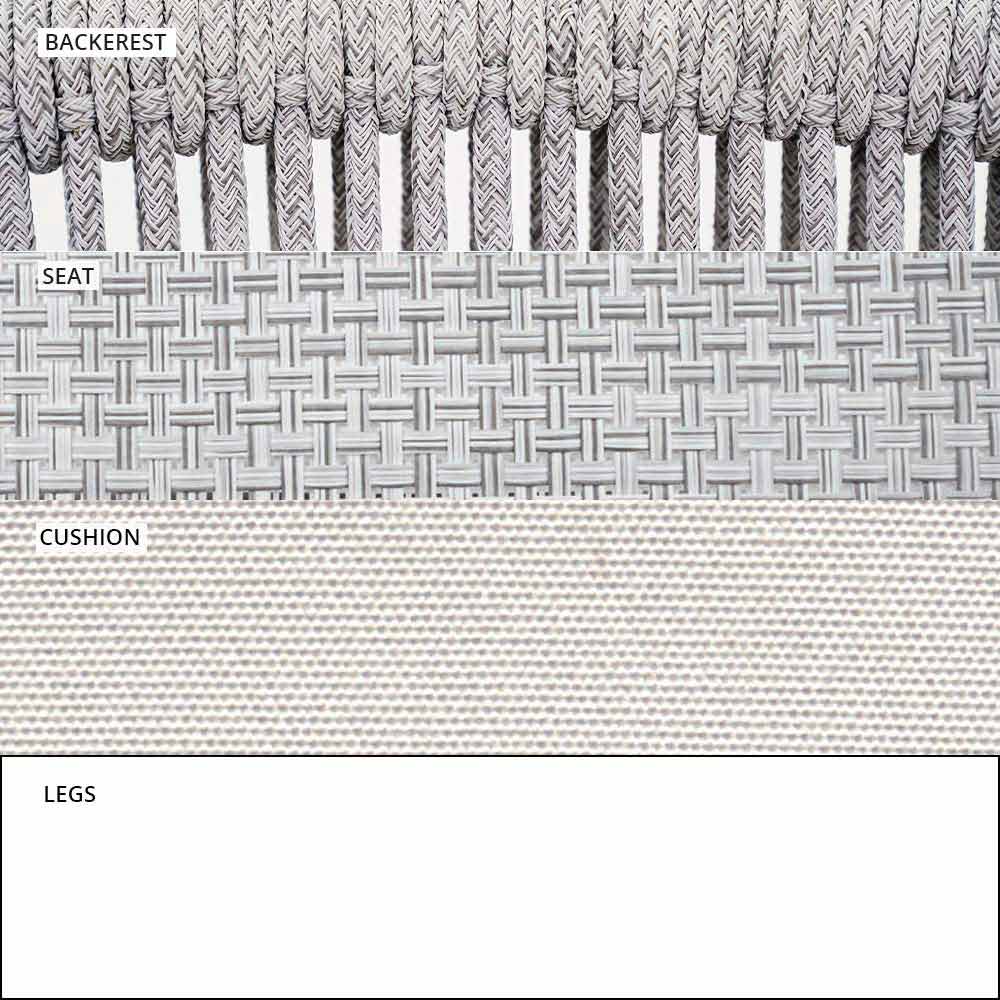 Smart fue hecho con una estructura de aluminio recubierta de polvo blanco, asiento en blanco VAR # TEX tejido técnico y de regreso en VAR # cable de TEX sintético blanco.