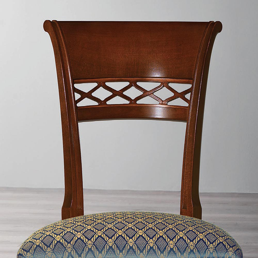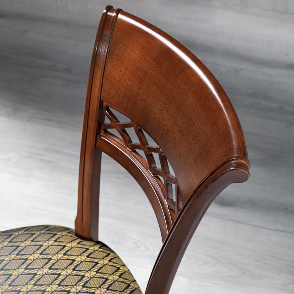 Esta silla de salón está fabricada íntegramente en Italia con estructura de madera de haya.disponible en varios acabados con respaldo decoradoy asiento en tela .