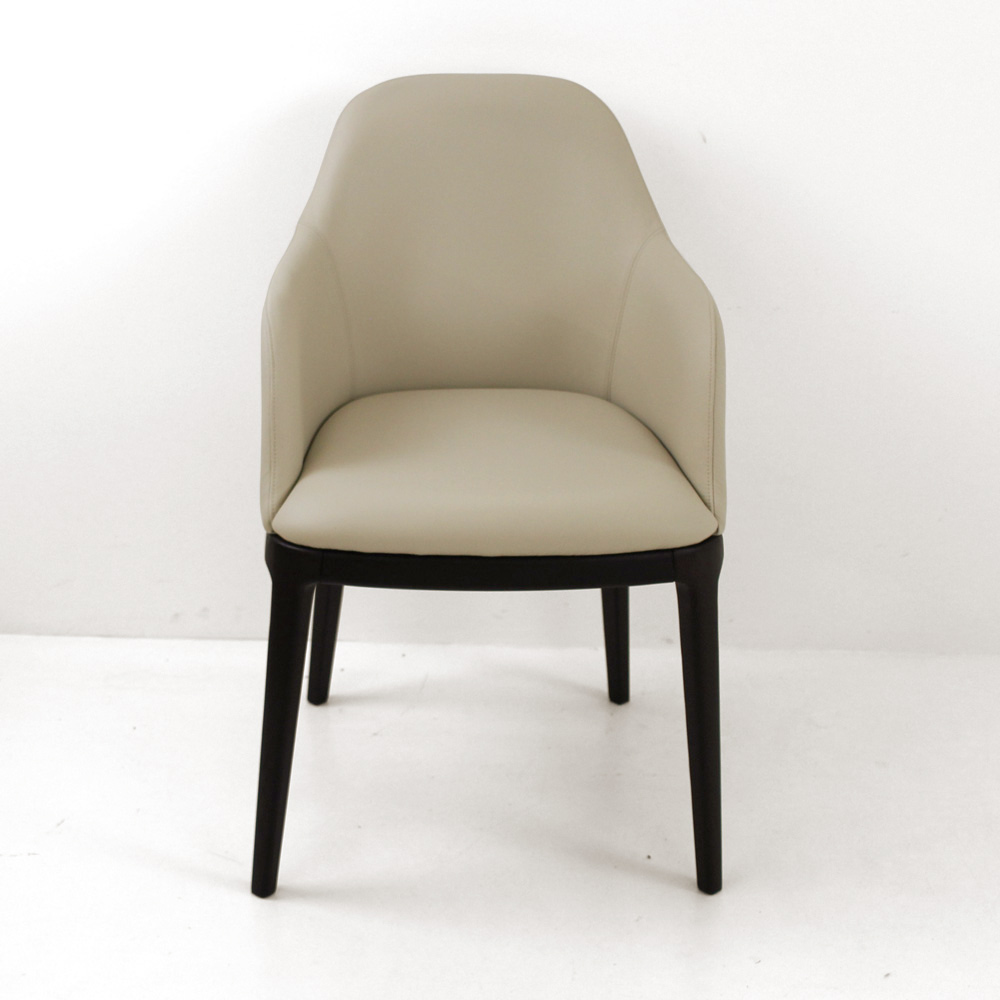 Silla de salón con reposabrazos íntegramente fabricada en Italia con estructura de fresno teñido roble oscuro y asiento de piel color hielo. La silla tiene un gusto clásico y atemporal y ofrece una opción de refinado confort de asiento . Sus líneas sinuosas y muy elegantes lo hacen idóneo para completar el mobiliario de cualquier salón, cocina y comedor, aportando a la estancia un toque refinado y único.