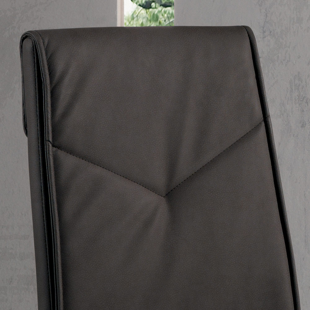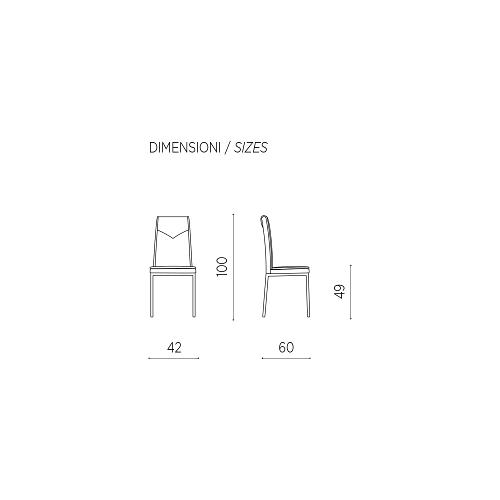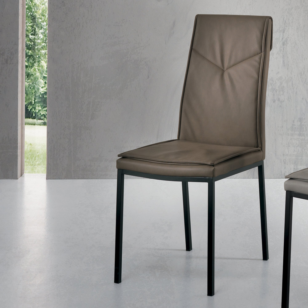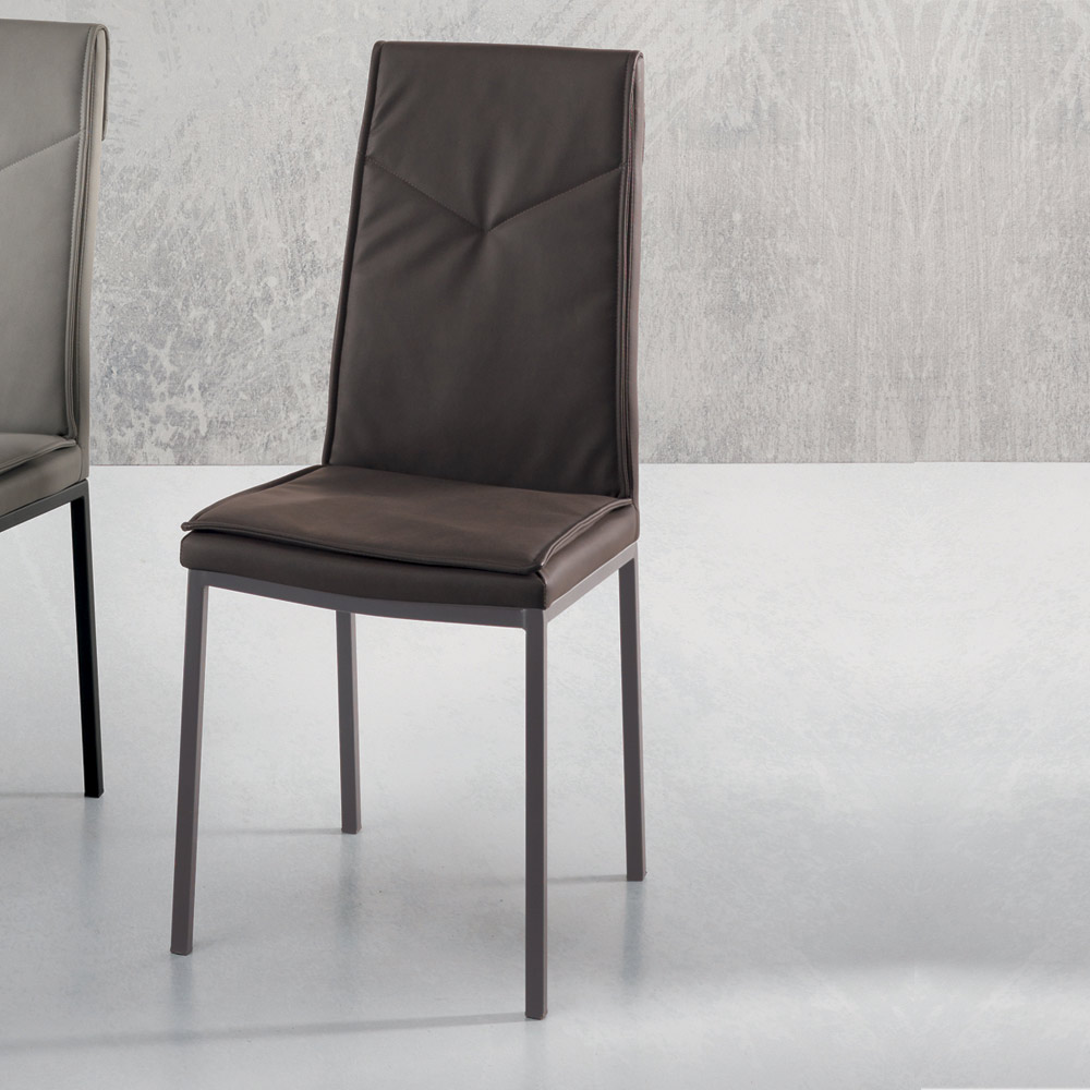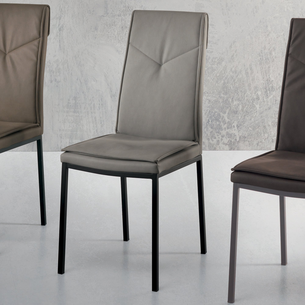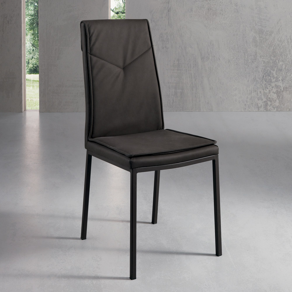 Silla de comedor con asiento acolchado revestido en ecopiel martillada y estructura en metal pintado . Una silla con un potencial inesperado caracterizada por formas y líneas simples y elegantes y por un estilo imponente y refinado . El uso de metal para la construcción de las patas otorga al producto solidez y robustez aumentando así su lado funcional mientras que el revestimiento en piel aumenta su valor completando su estética a través de un toque exclusivo y refinado .