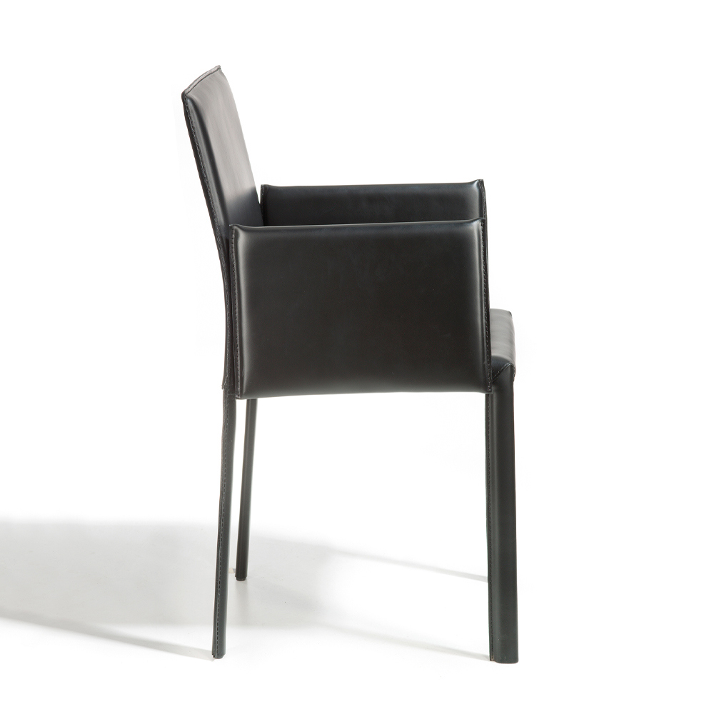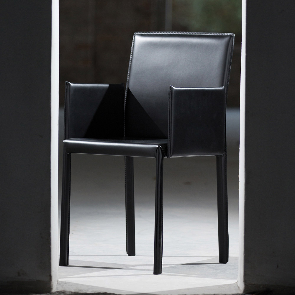 Silla de comedor con reposabrazos , fabricada íntegramente en Italia , completamente tapizada en piel con acabado negro . Estructura con pata ovalada 30x15 mm. Gracias a su elegancia y encanto atemporal , da carácter a la estancia y es perfecto para amueblar tus salones, comedores y cocinas con gusto y estilo sin renunciar a la funcionalidad y el confort.
