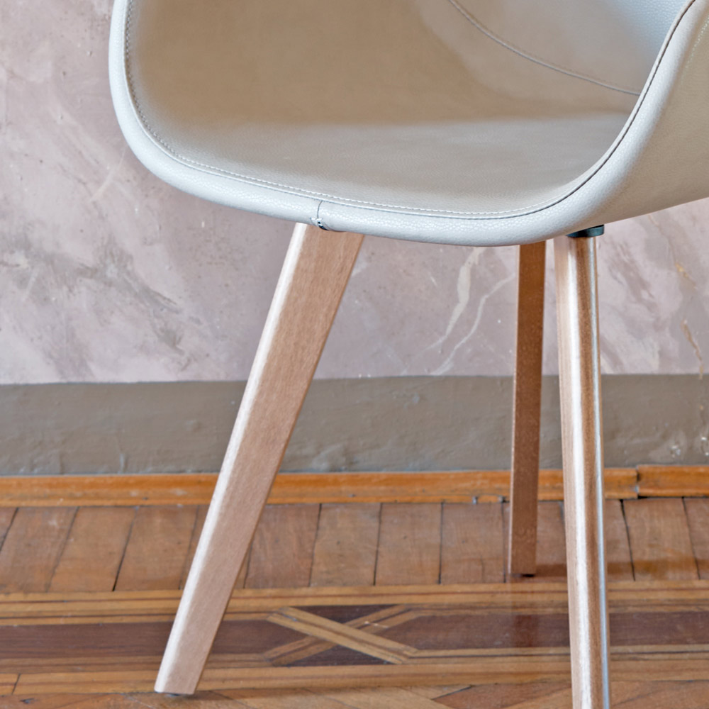 NB: la silla está disponible en diferentes tapizados y acabados. Bajo pedido también está disponible con costuras en contraste. Además, la estructura de haya también está disponible en color nogal. Contáctenos para más información o para una cotización utilizando el formulario " Solicitar información ".