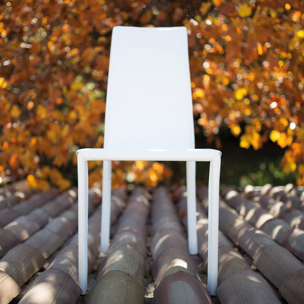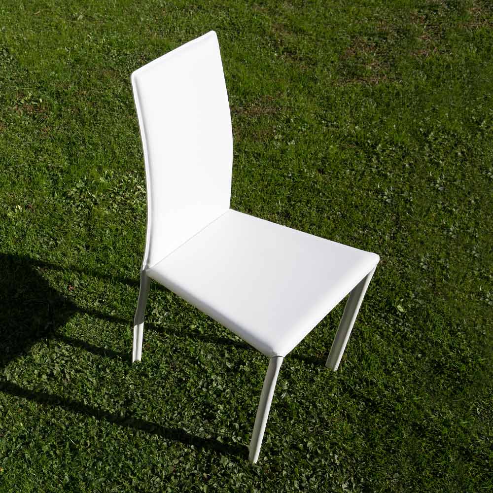 Silla de comedor íntegramente fabricada en Italia, completamente revestida en piel blanca y estructura con pata redonda de ø 22 mm.