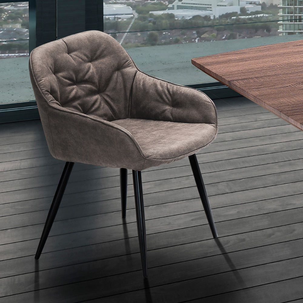 Silla de comedor con patas en metal pintado negro mate y asiento acolchado tapizado en piel sintética efecto envejecido . Un accesorio de decoración elegante y con clase que se caracteriza por el respaldo particular enriquecido por costuras que dan a la estética final de la silla un efecto vintage y refinado . El resultado es un asiento acogedor y confortable que contribuye al mismo tiempo a completar el estilo de la habitación a través de su personalidad cautivadora y su carácter refinado .