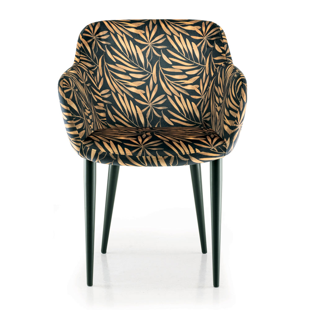 Silla de comedor made in Italy completamente revestida en tela con patas en acero pintado de negro . Un diseño imponente y refinado que combina a la perfección con ambientes de estilo moderno en los que se convierte en protagonista gracias a su marcada personalidad contemporánea . La combinación perfecta del toque moderno del acero y el aspecto original del tejido y su textura permite crear una solución de decoración exclusiva, ideal para quienes buscan funcionalidad y diseño en un solo producto. El asiento se caracteriza por líneas y formas suaves y envolventes que aseguran un excelente confort además de ofrecer una estética original y vanguardista .