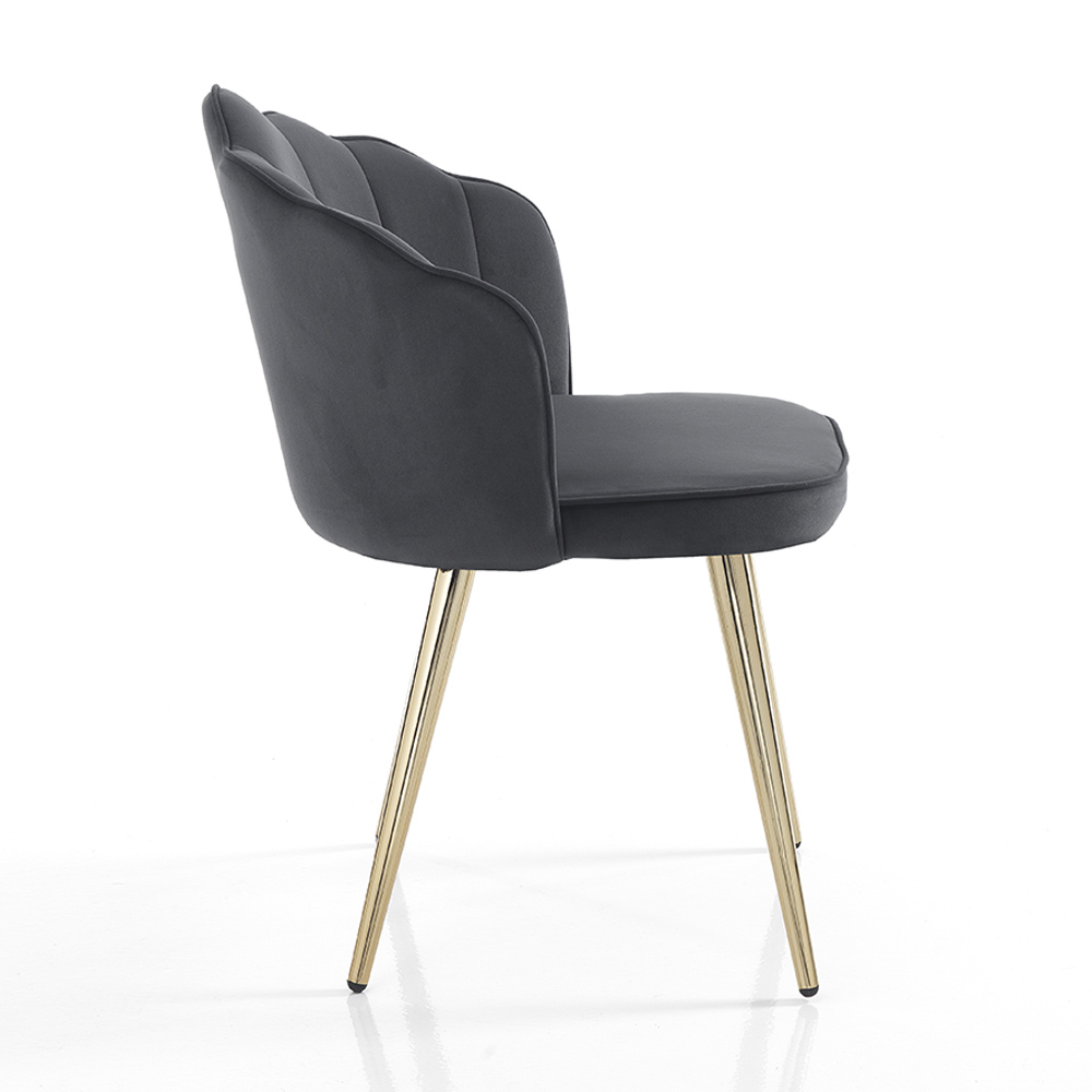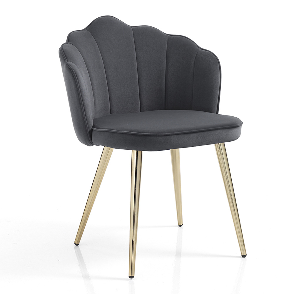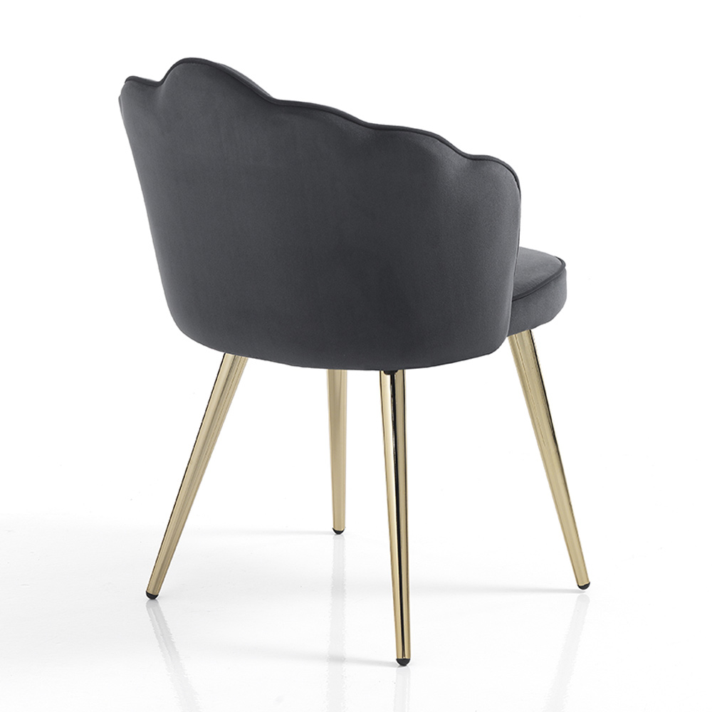 Silla de comedor con asiento acolchado tapizado en suave tejido efecto terciopelo y patas en metal pintado con acabado dorado brillante . Un mueble con un diseño original caracterizado por una combinación de acabados y colores que enfatizan la elegancia de la silla. Su forma inusual y alma romántica ofrece un asiento particularmente cómodo y envolvente, simulando la sensación de un cálido abrazo y permitiendo a los que se sientan disfrutar de maravillosos momentos dedicados a la relajación.