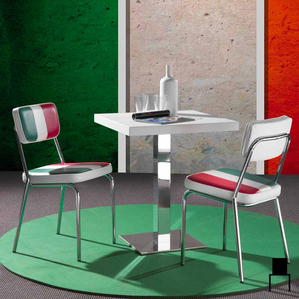 Cada silla se compone de una estructura cromada, revestida de ecopiel con acabado en bandera tricolor que recuerda el estado Italiano.
