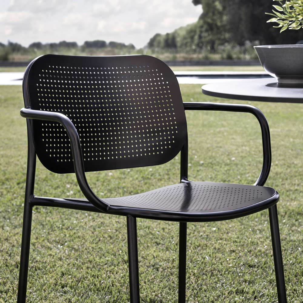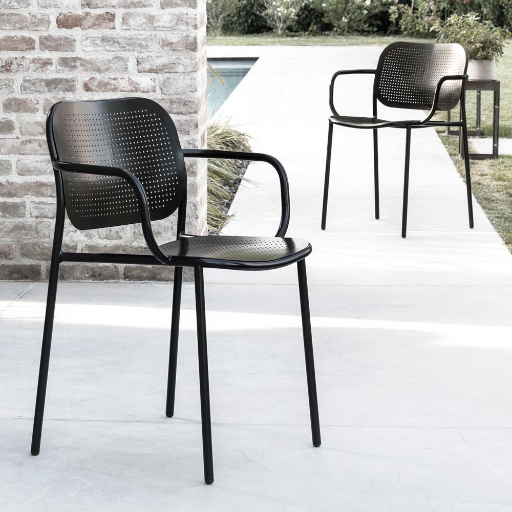 Silla apilable para exteriores con estructura tubular de metal pintado completada por el asiento y el respaldo en chapa con textura perforada, un efecto que revisita el clásico tejido vienés en clave contemporánea. Realizada a través de un proceso de producción 100% Made in Italy , esta silla ofrece una excelente solidez gracias al uso de materias primas de alta calidad y al tratamiento especial del metal que hace que el acabado del producto sea particularmente resistente a los agentes atmosféricos.
