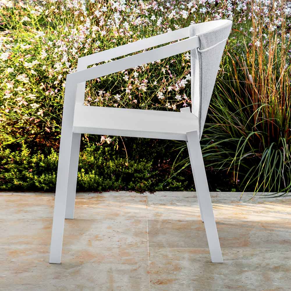 Silla apilable para exterior en aluminio, textilene y cojín de tela, de alta calidad made in Italy, 4 piezas.