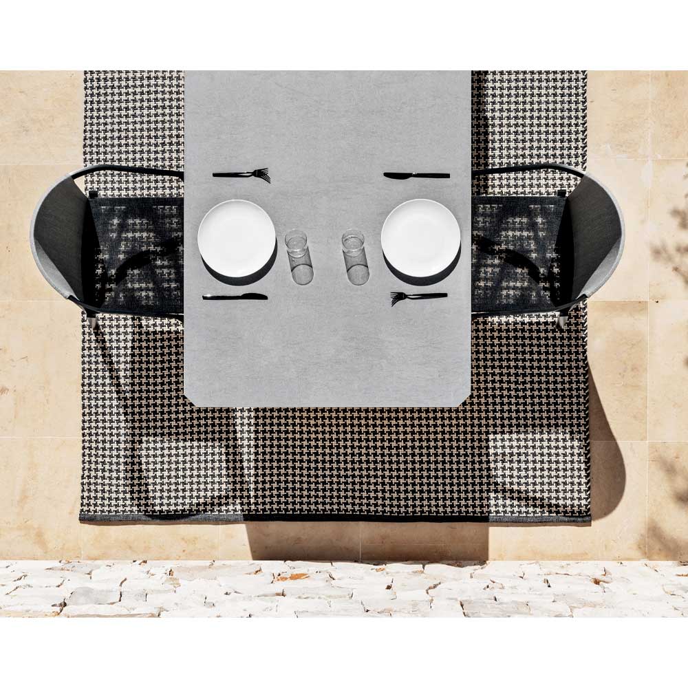 La colección se caracteriza por el detalle de la pata de aluminio como punto focal combinado con el rigor formal y modular del acolchado, para experimentar el aire libre en términos de máxima relajación y convivencia, sentado en el sofá, alrededor de una mesa o tumbado en el cama solar. .