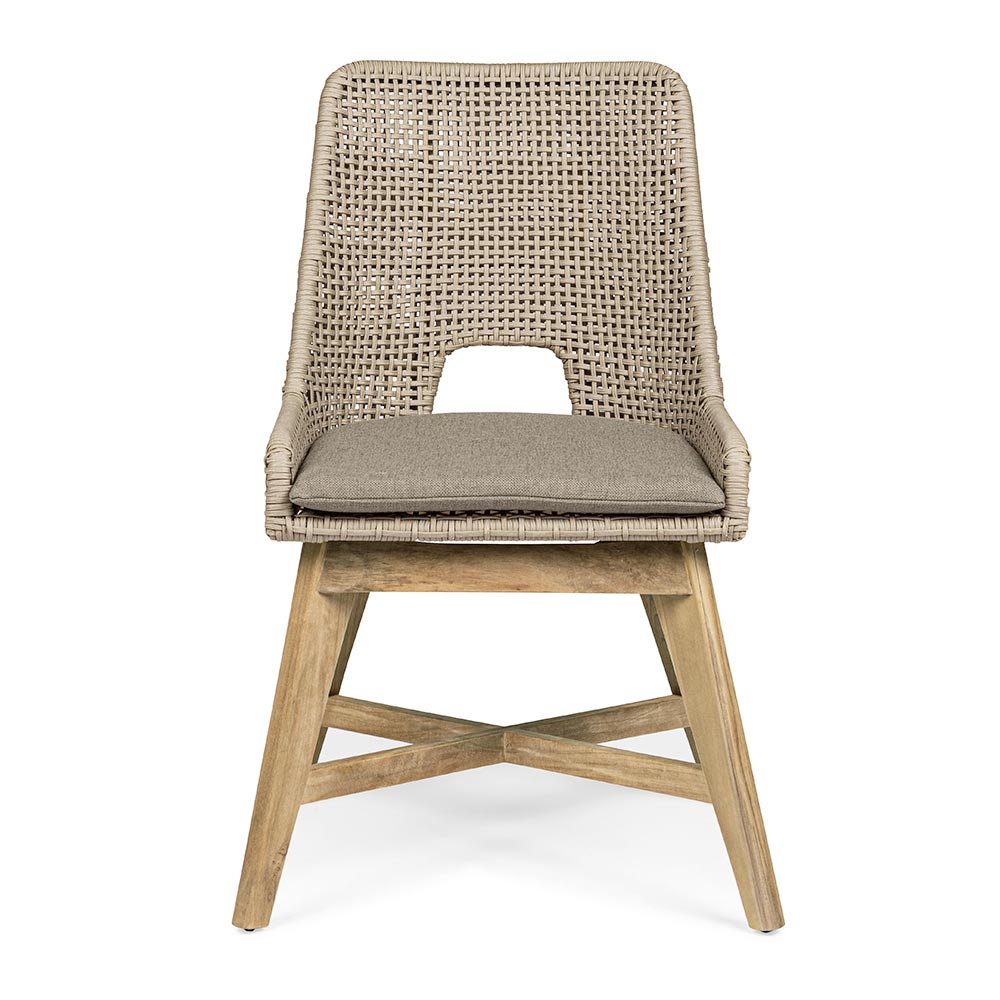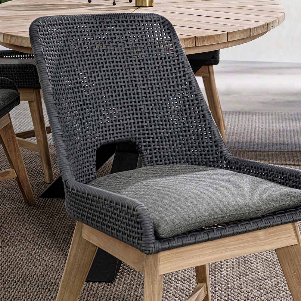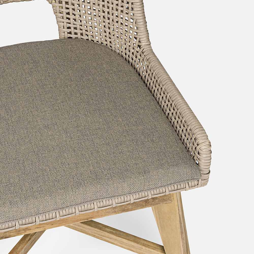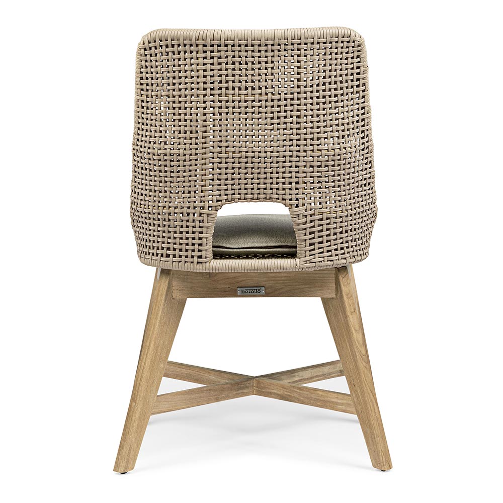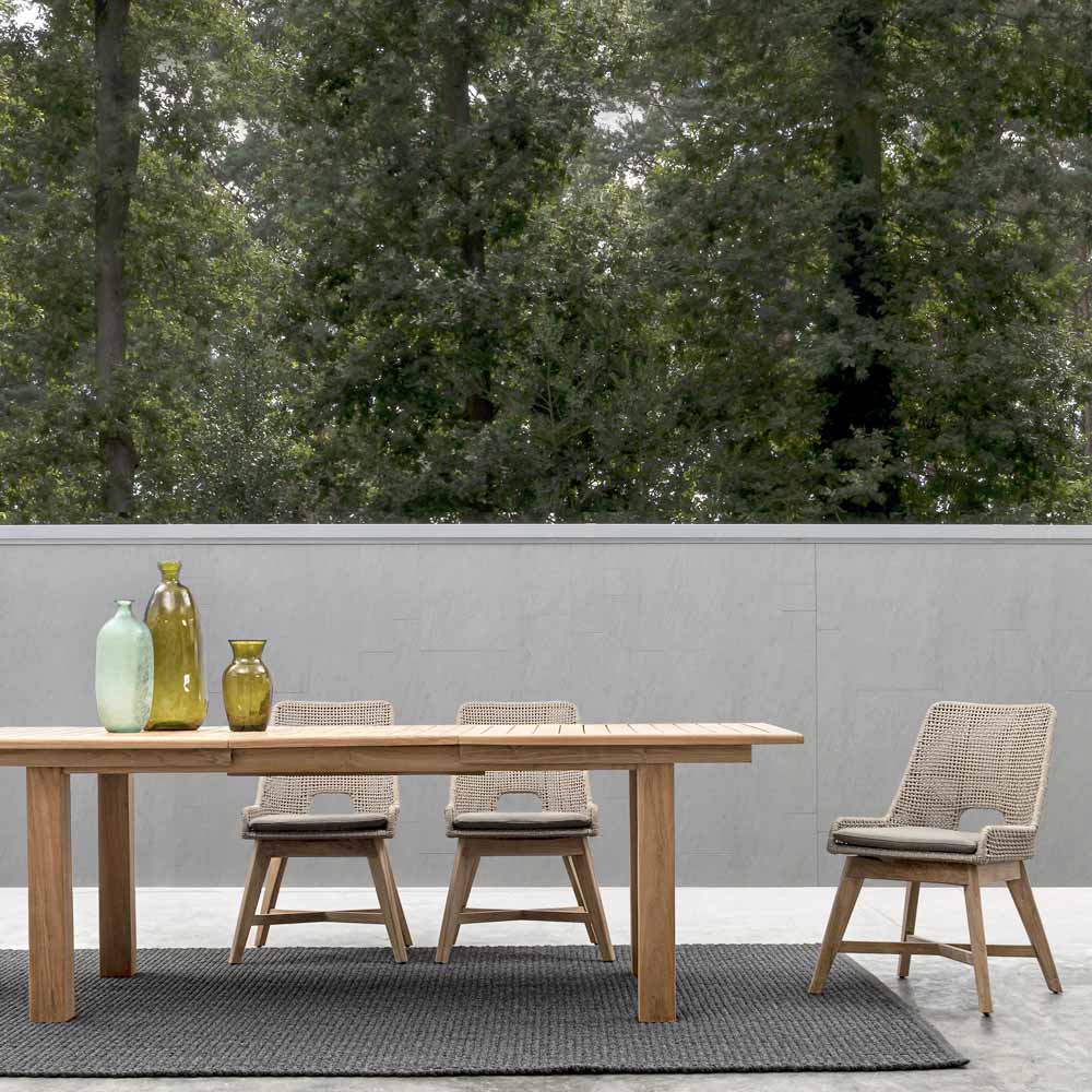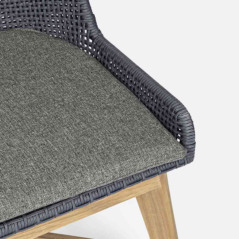 Cojín de asiento con funda desenfundable con tejido Sunproof Olefin (100% polipropileno). Patas de teca - SVLK (madera certificada procedente de bosques sostenibles).
