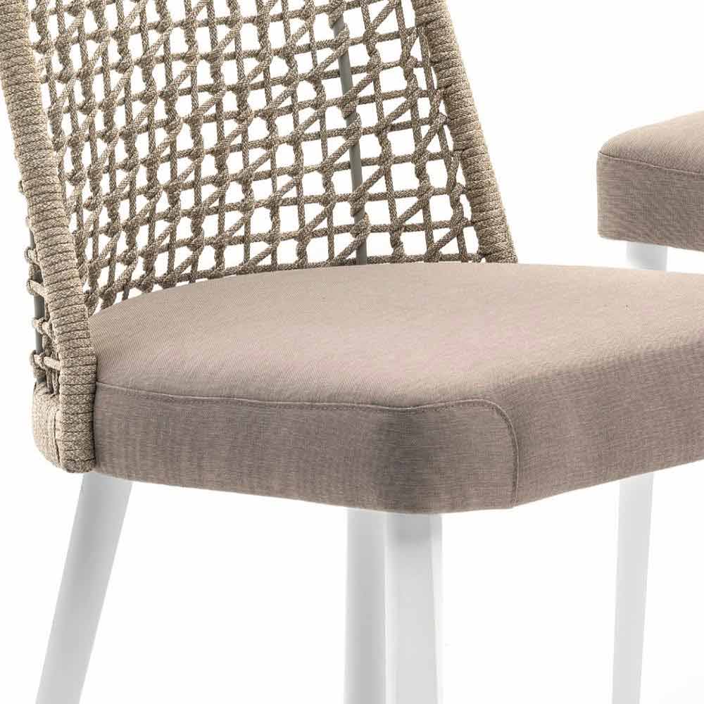 Emma es una silla de jardín caracterizada por una estructura de fibra sintética tejida a mano con un marco de aluminio con recubrimiento de polvo beige .