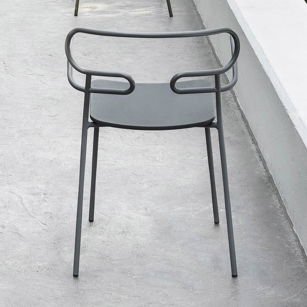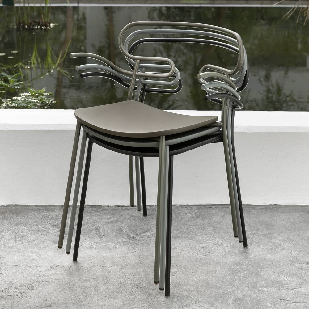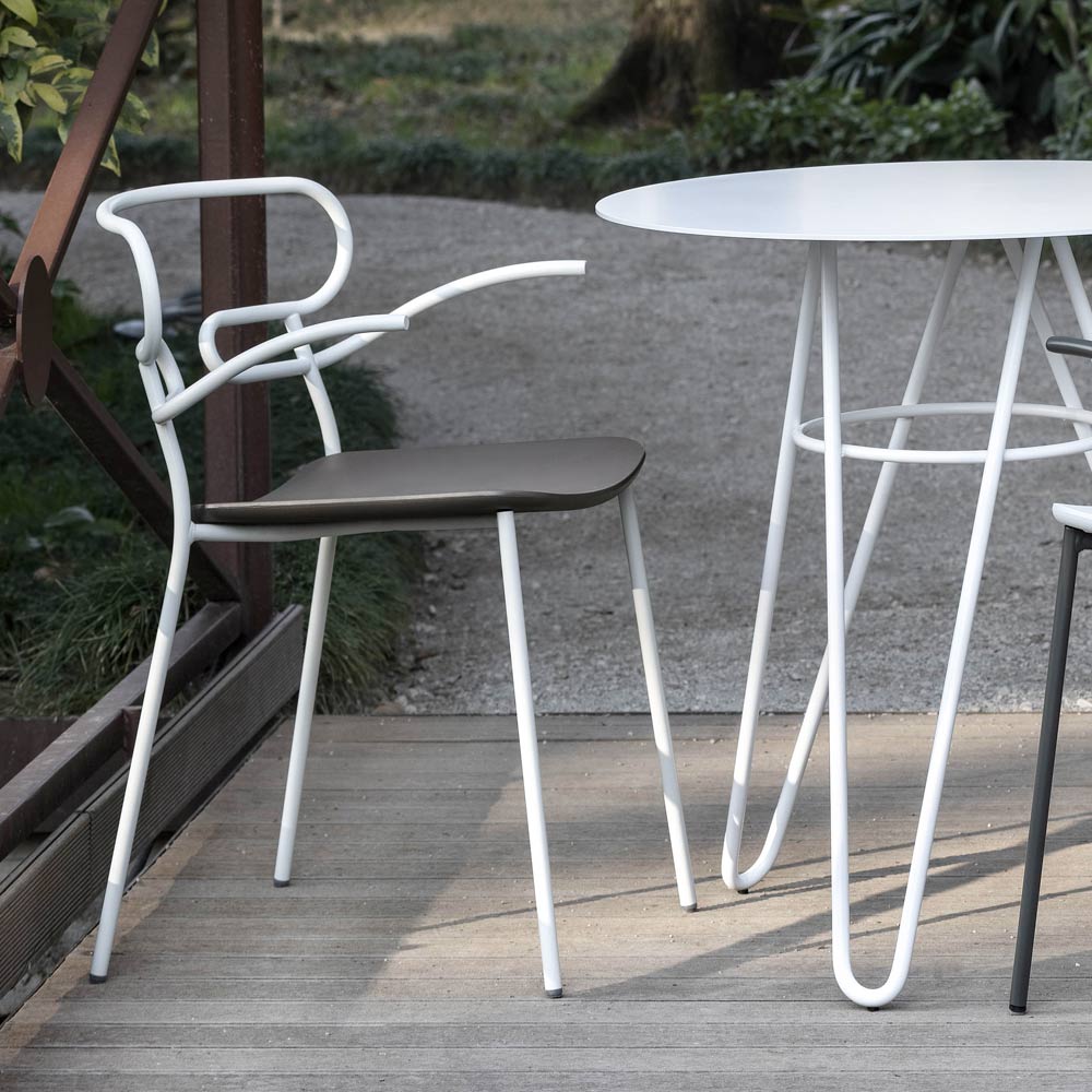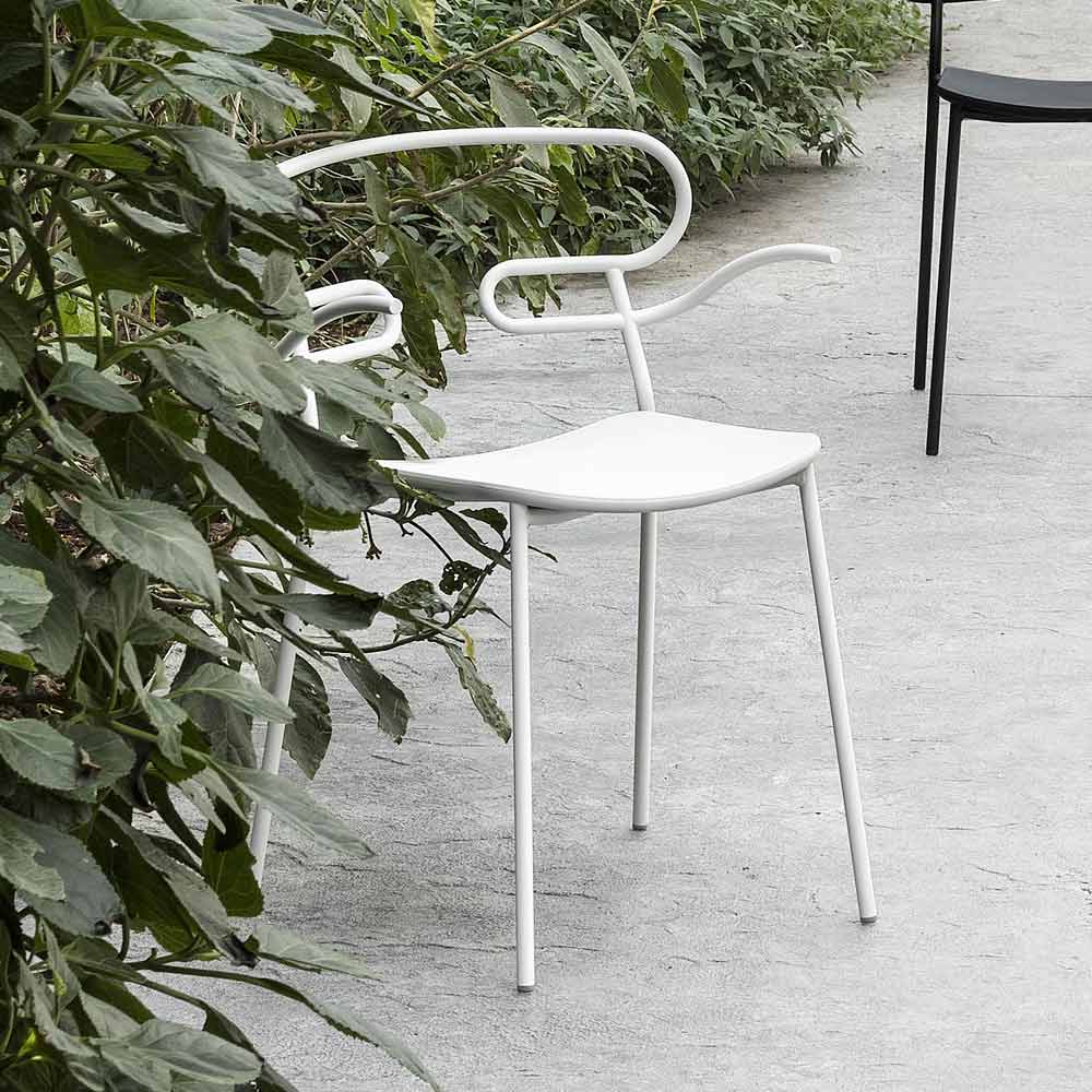 Silla de exterior fabricada en Italia con estructura de metal pintado y asiento de poliuretano. Sencillo y esencial, este complemento destaca por sus líneas ligeras y la particular forma del respaldo obtenida a través de la curvatura de un solo tubo metálico, creando así un diseño insólito y vanguardista. Ideal para decorar con personalidad tus espacios exteriores como jardines, verandas y terrazas, tiene una característica especialmente funcional que es la posibilidad de apilamiento para obtener una solución práctica y de fácil ordenamiento optimizando tus espacios cuando no se utilizan las sillas.