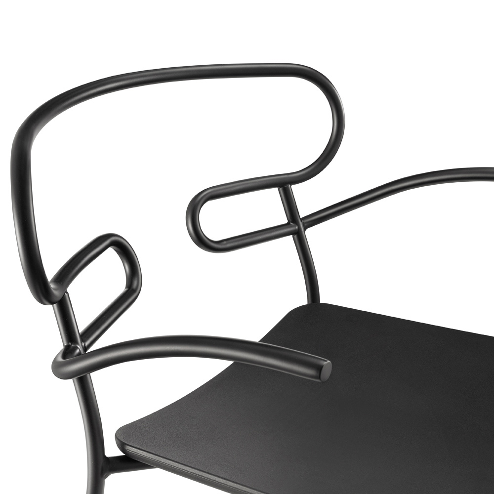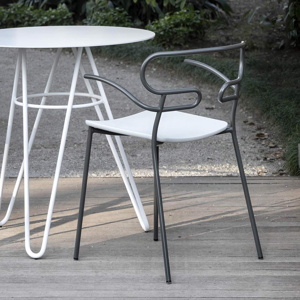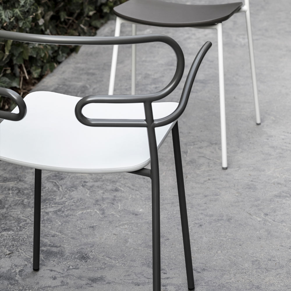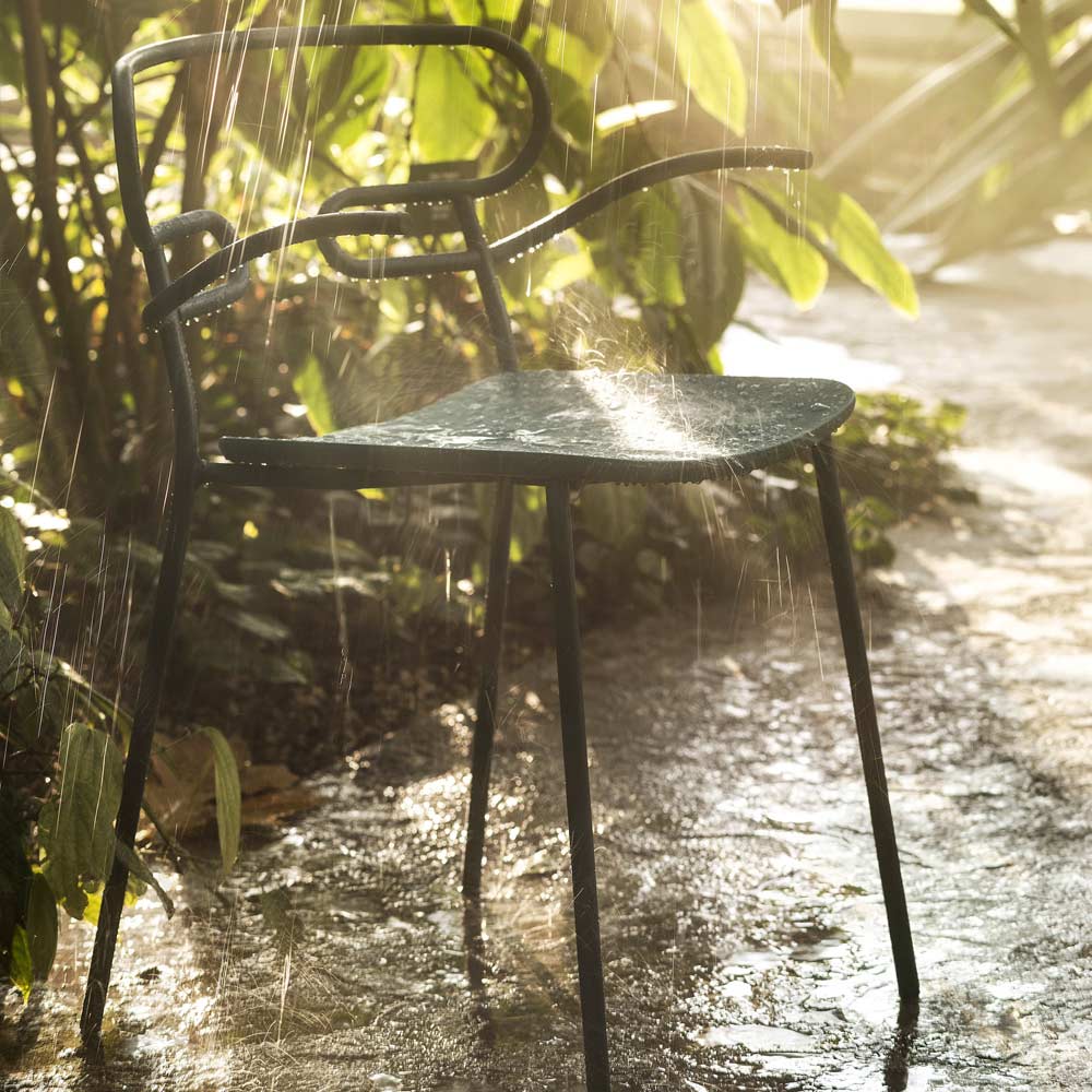 Silla de exterior fabricada en Italia con estructura de metal pintado y asiento de poliuretano. Sencillo y esencial, este complemento destaca por sus líneas ligeras y la particular forma del respaldo obtenida a través de la curvatura de un solo tubo metálico, creando así un diseño insólito y vanguardista. Ideal para decorar con personalidad tus espacios exteriores como jardines, verandas y terrazas, tiene una característica especialmente funcional que es la posibilidad de apilamiento para obtener una solución práctica y de fácil ordenamiento optimizando tus espacios cuando no se utilizan las sillas.