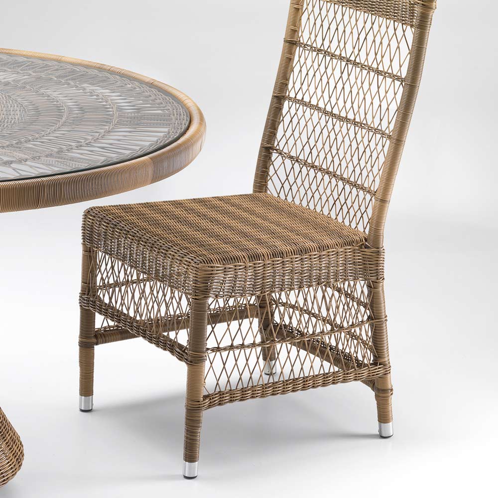 La silla de exterior Gigi tiene una estructura con un marco de aluminio con recubrimiento en polvo , sobre el que se teje a mano fibra de poliratán de 3 mm de grosor de la más alta calidad.