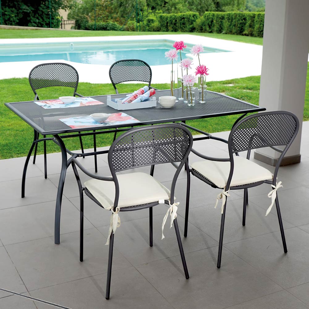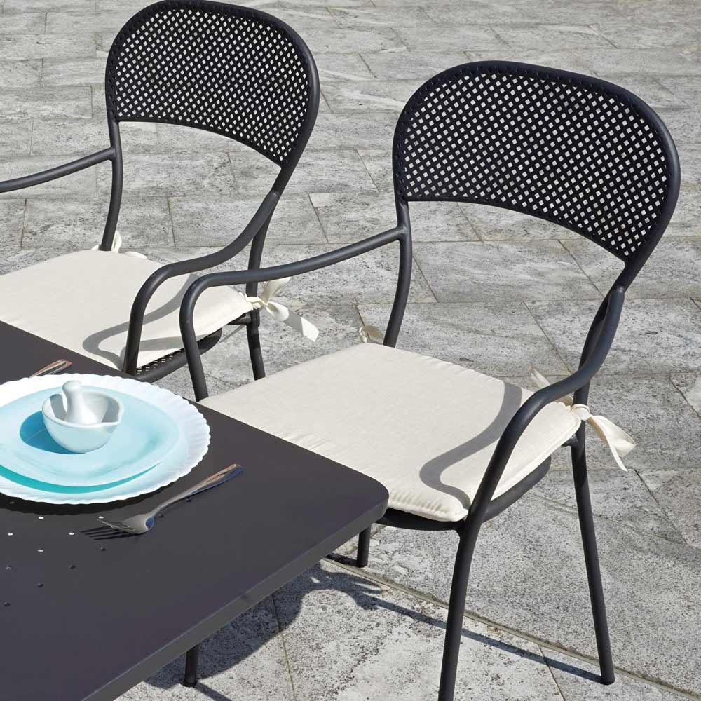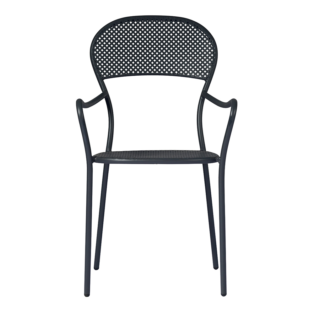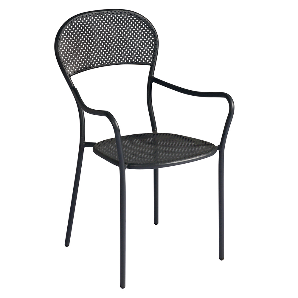 Silla de exterior realizada en hierro acabado gris antracita con estructura apilable completa de prácticos brazos . Este mueble moderno tiene un diseño inconfundible con un asiento cómodo y confortable . Una idea de decoración capaz de dar carácter y personalidad a cualquier ambiente exterior, desde los domésticos como jardines y terrazas hasta espacios contract como bares y restaurantes al aire libre.